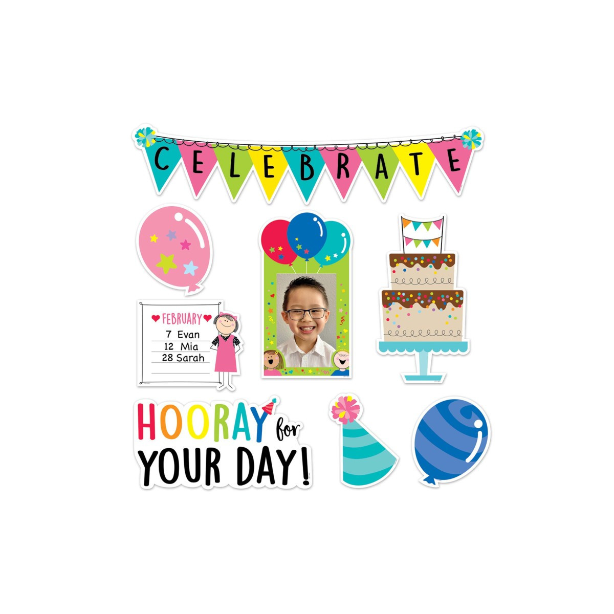 Mini bulletin board set also includes an instructional guide that depicts display ideas and suggests fun activities for celebrating class birthdays.