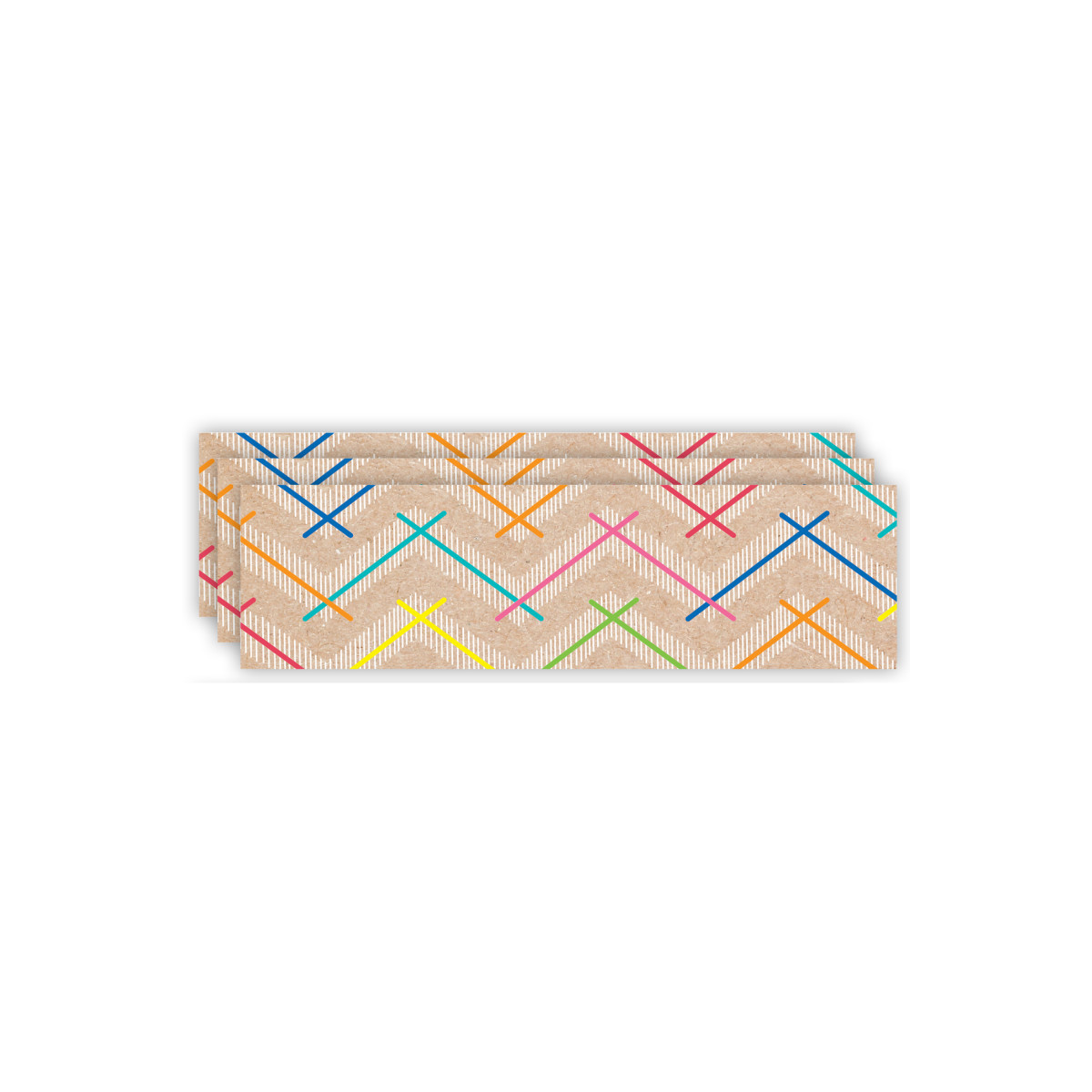 Add a creative touch to your bulletin board displays with the Colorful Kraft Chevron EZ Border, which features a colorful chevron pattern on a kraft-style background.