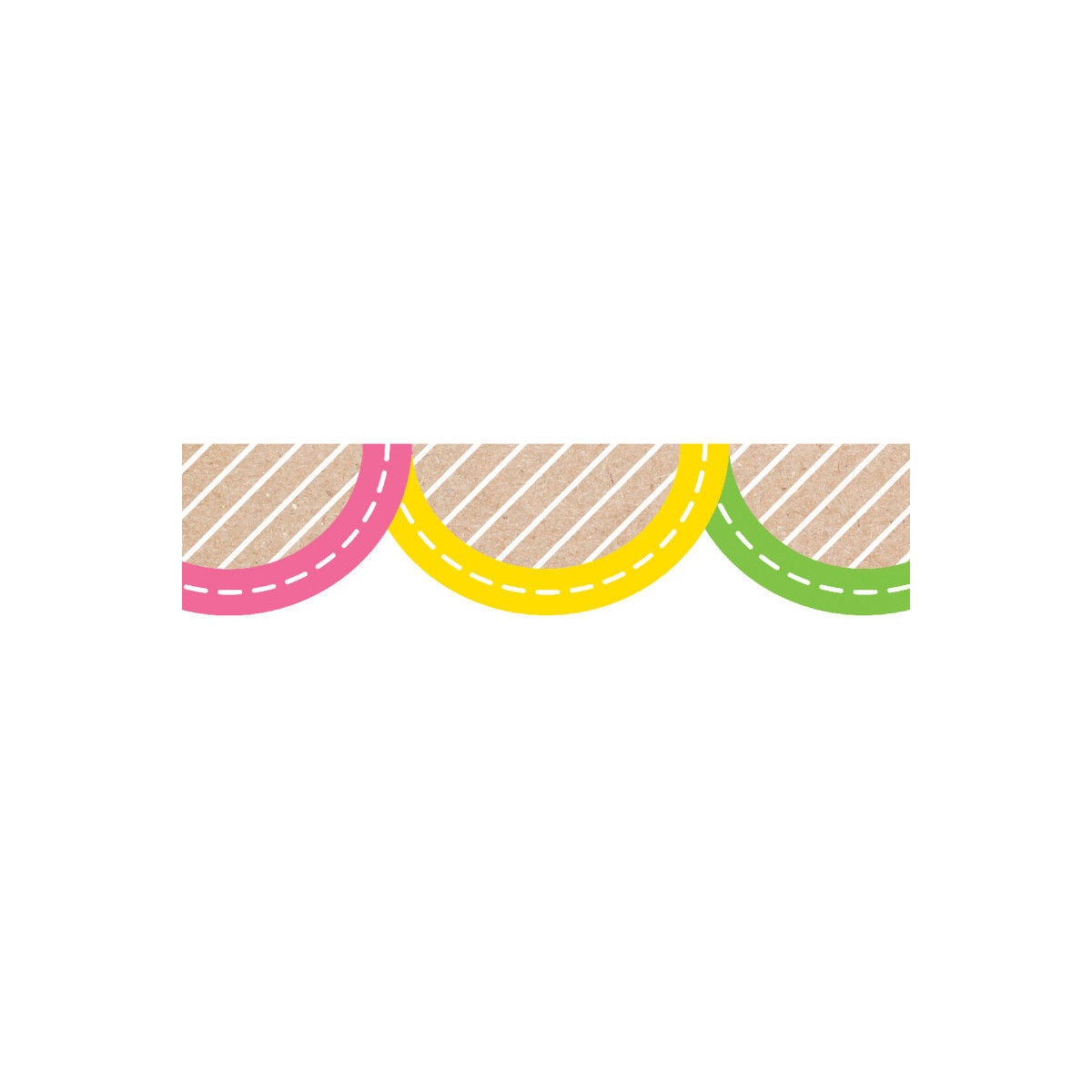 Dress up bulletin boards, rooms, hallways, and common areas with this Colorful Kraft Jumbo Scallops EZ Border. Each scallop features a stitched look on colorful edging to brighten any space. Perfect for use on bulletin boards in a wide variety of classroom, office, and school settings. These EZ borders come in smaller strips, which are easier to manage and store. Each package comes with enough borders to complete 2 full bulletin boards. Strips measure 3" x 24". Each pack includes 24 strips for a total of 48 feet.