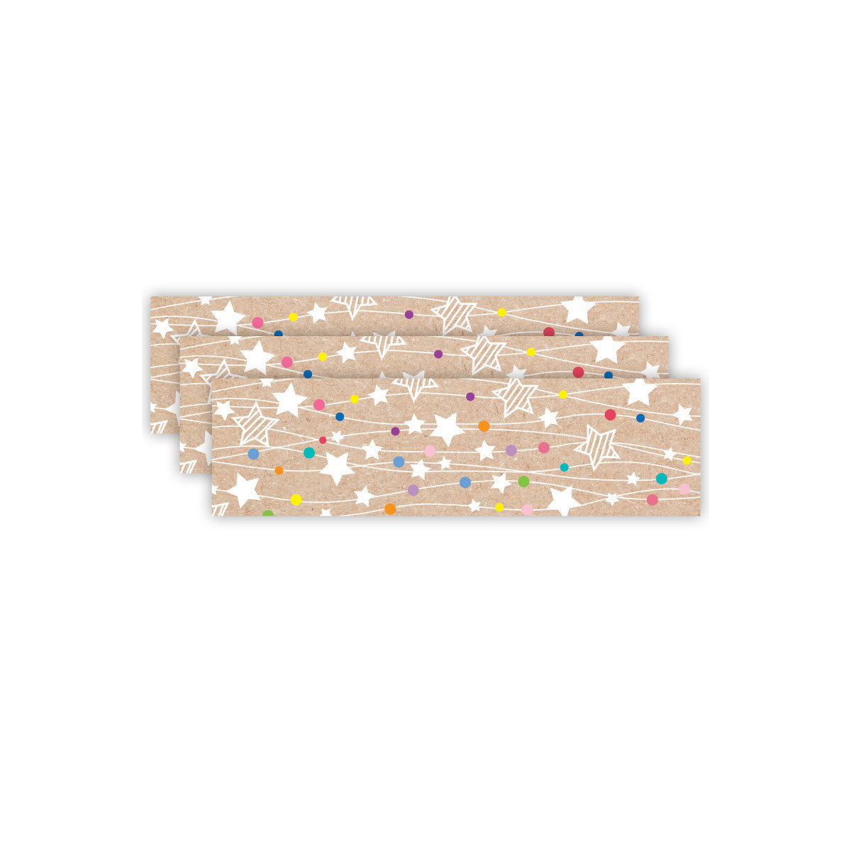 Add a touch of whimsy to your wall displays with the Colorful Kraft Stars on Strings EZ Border, which features stars and colorful dots suspended on strings on a kraft-style background. Perfect for use on bulletin boards in a wide variety of classroom, office, and school settings. These EZ borders come in smaller strips, which are easier to manage and store. Each package comes with enough borders to complete 2 full bulletin boards. Strips measure 3" x 24". Each pack includes 24 strips for a total of 48 feet. Sold as 3 packs for a total of 72 strips (144 feet).