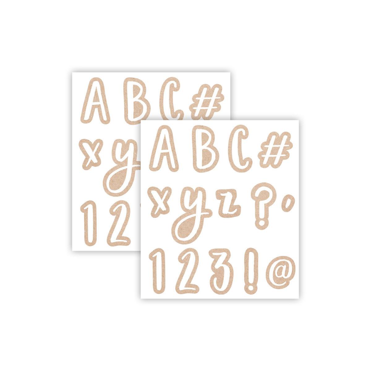 Add style to any display with these bold white letters on a kraft-style background. Each pack includes 212 pieces: upper and lowercase letters, punctuation marks, numbers, and social media symbols. The casual look of these punch-out letters makes them a perfect choice for bulletin boards or displays in a school, office, dormitory, church, or daycare center. Also great for creating banners, party signs and more! Measures approximately 4"h. Sold as 2 packs for a total of 424 pieces.