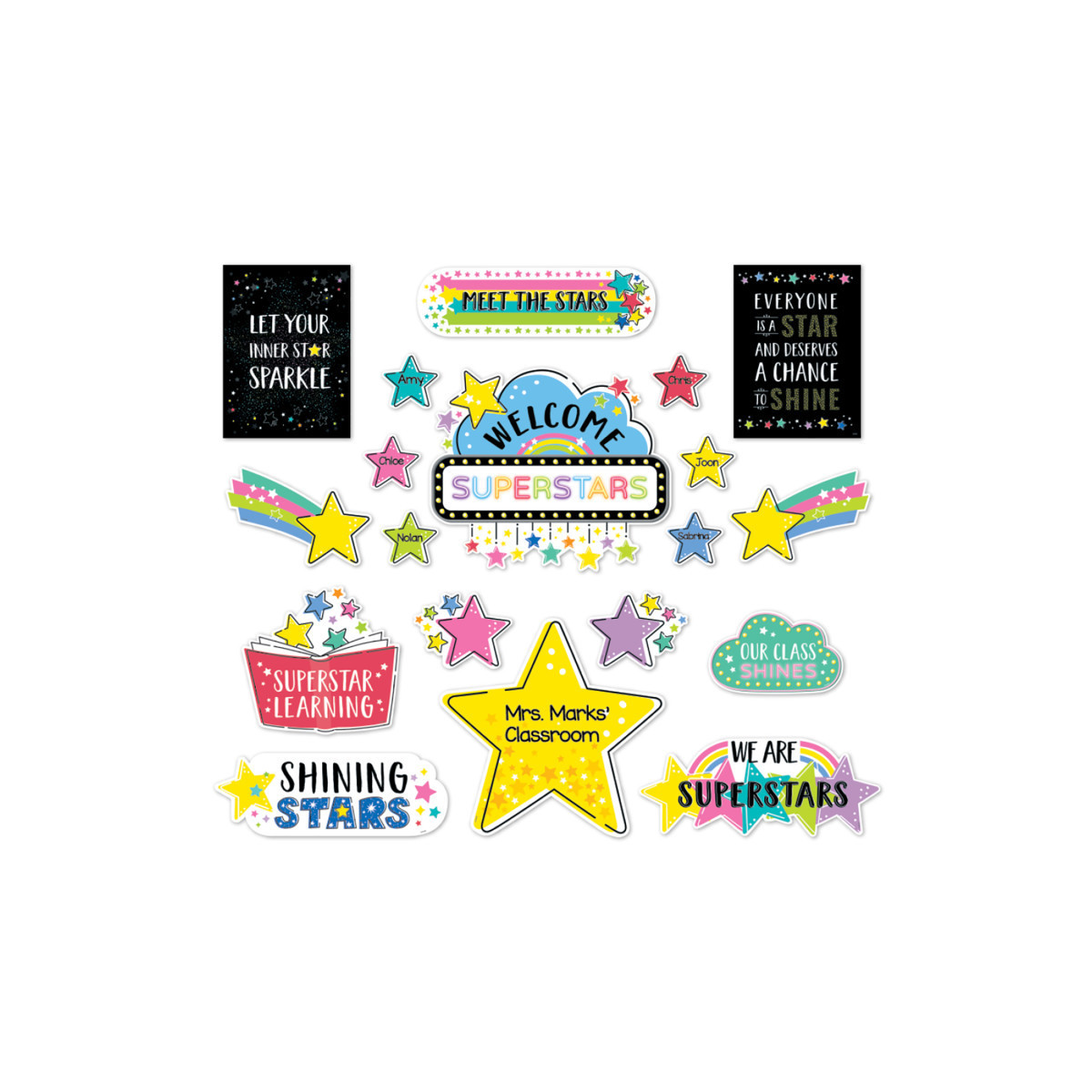 - WHAT'S INCLUDED: This 43-piece bulletin board set includes a welcome banner, 30 student stars, 5 signs, 2 mini posters, and additional star pieces.