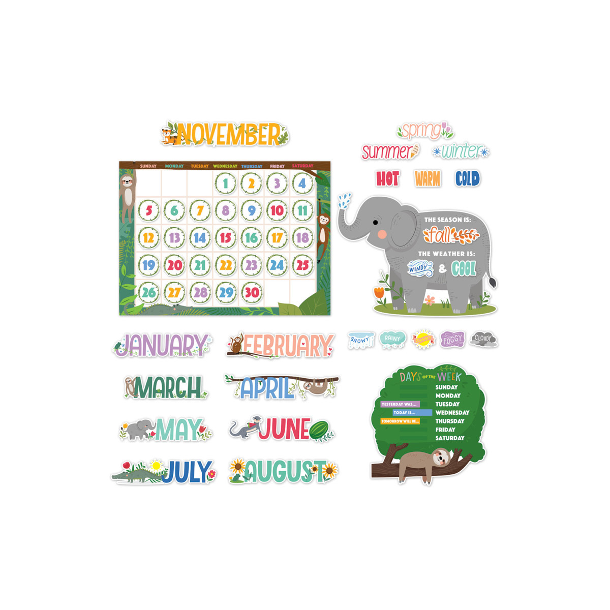 This colorful Jungle Friends Calendar Set features favorite jungle-dwelling creatures along with accents symbolic of each month. Use the moveable pieces to teach calendar concepts, display the month of the year, the days of the week, and record the changing seasons and daily weather conditions.
