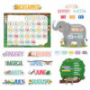 This 67-piece classroom calendar set includes: a calendar chart, 12-month headlines, 33 pre-numbered calendar days, and 2 blank calendar days. The set also includes a days-of-the-week chart, a seasons and weather chart, and coordinating labels. The bright colors and friendly animals make this set perfect for children at home or at daycare, preschool, or elementary school. This bulletin board set also comes with an instructional guide that includes ideas for using the set to help students reinforce basic skills in a learning center, observe the seasons and weather, practice calendar math, and record specials days on their own calendar reproducible.