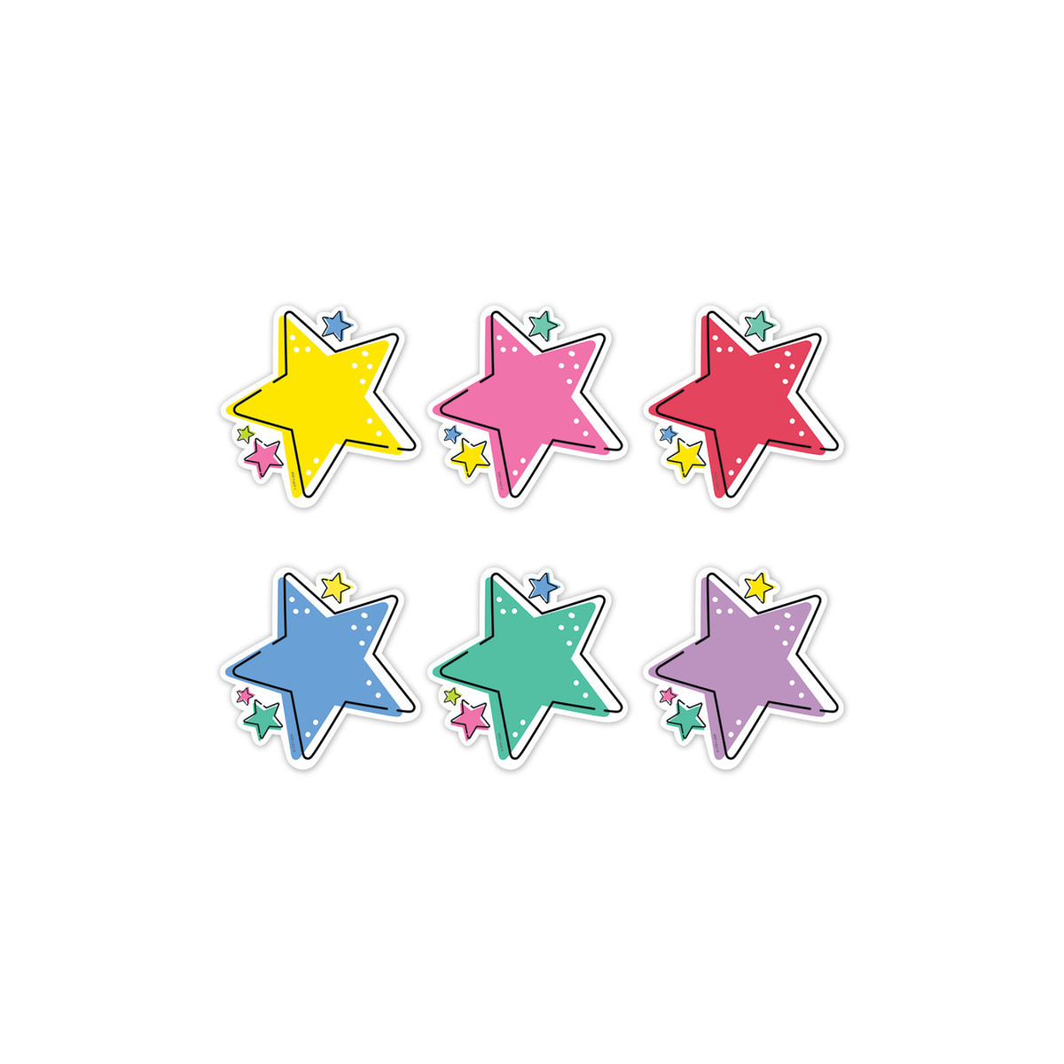 Brighten any room with the colorful Stars 6" Designer Cut-Outs. Coming in yellow, pink, red, blue, green, and purple designs, these cut-outs are the perfect accent for class messages, writing assignments, learning center activities, bulletin boards, and more! Use them to give special recognition for a job well done or to write a positive note to a student or parent. The cut-outs can also be used to make quick and easy labels on cubbies, student folders, supply bins, and binders. Cut-Outs measure each approximately 5.625"w x 5.375"h. Each pack includes 36 pieces: 6 each of 6 designs: Yellow, Pink, Red, Blue, Green, and Purple. Coordinates with Star Bright products.