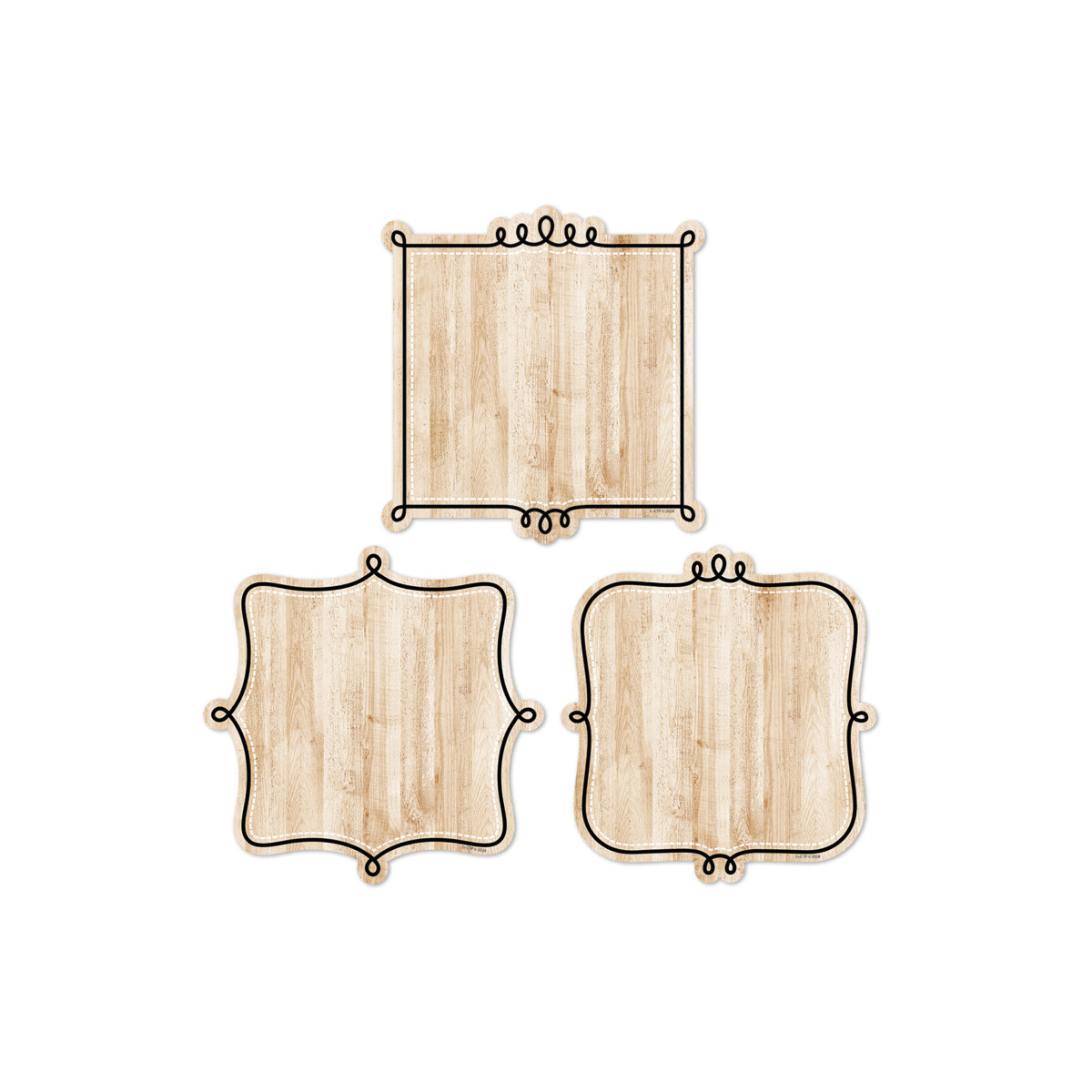 Bring a fresh look to your displays with these Loop-de-Loop on Wood 6" Designer Cut-Outs. Each cut-out features black loops on a neutral wood background. Framed by stylish looping lines, these cut-outs are perfect for class messages, writing assignments, learning center activities, accenting bulletin boards, and more! Use them to give special recognition for a job well done or to write a positive note to a student or parent. The cut-outs can also be used to make quick and easy labels on cubbies, student folders, supply bins, and binders. Each pack includes 36 pieces, 12 each of 3 designs: 12 Doodle frame 1 (5.425"W x 5.625"H each), 12 Doodle frame 2 (5.725"W x 5.625"H each), and 12 Doodle frame 3 (5.25"W x 5.625"H each). Coordinates with Core Décor products.