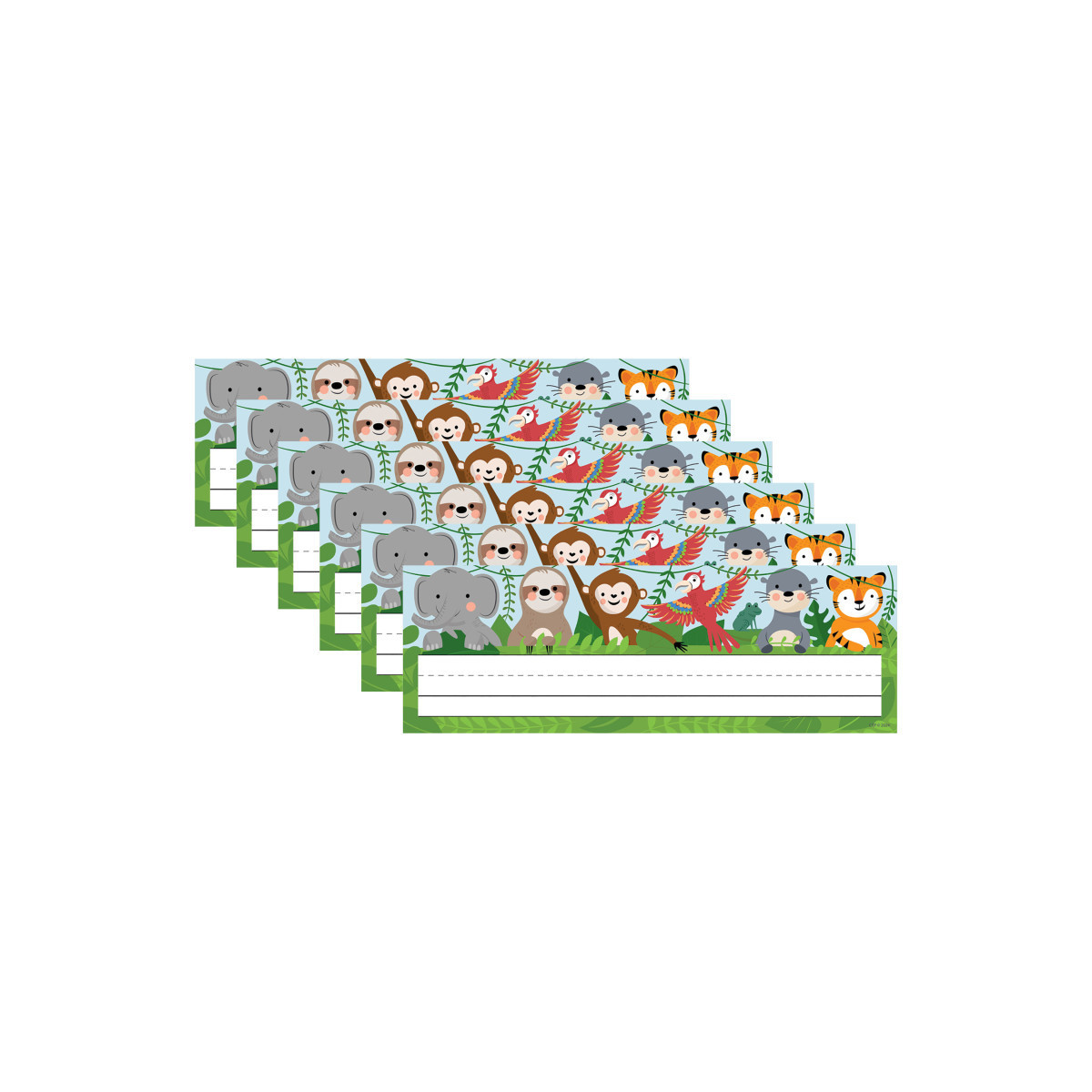 The friendly animals on these Jungle Friends Name Plates are an adorable way to personalize student desks, cubbies, seats at the table, take-home bags, classroom cabinets, folders, and more! Student name plates are great for use in classrooms, day care centers, or preschools. Coordinates with Jungle Friends products. Name plates measure 9-1/2" x 3-1/4". Each pack includes 36 name plates. Sold as 6 packs for a total of 216 name plates.