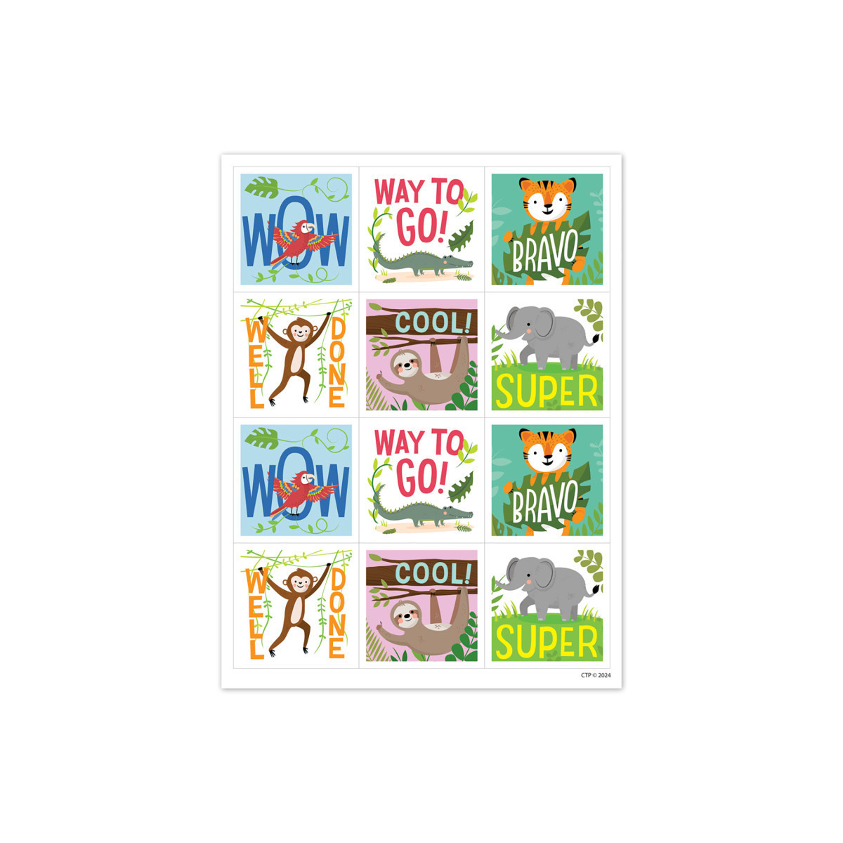 Reward students with these Jungle Friends Rewards Stickers. Inspirational sayings, such as "Well Done," "Way to Go!," and "Bravo," are paired with friendly jungle animals to create motivating reward stickers that will make students feel proud of their efforts. Coordinates with Jungle Friends products. Measures approximately 1-1/2" x 1-1/2". Each pack includes 60 stickers.