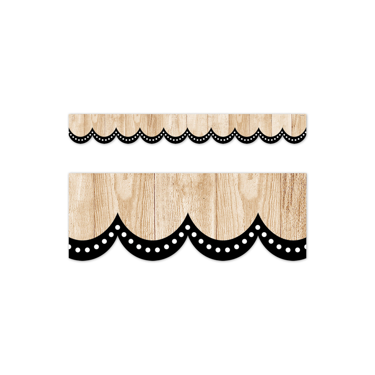 Trim your bulletin boards in style with this Dotted Scallops on Wood EZ Border. The border features a natural wood look with strands of white dots on a black background. This EZ Border comes in smaller strips, which are easier to manage and store. Each package comes with enough border to complete 2 full bulletin boards. Each pack includes 24 strips measuring 3" x 24" for a total of 48 feet per package.