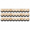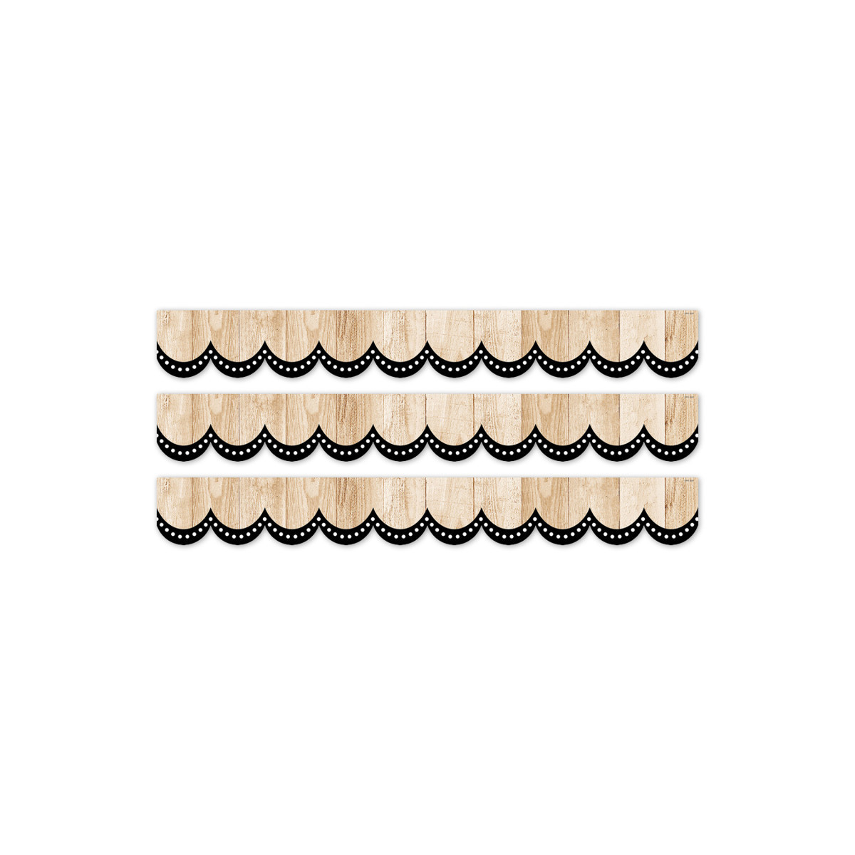 Trim your bulletin boards in style with this Dotted Scallops on Wood EZ Border. The border features a natural wood look with strands of white dots on a black background. This EZ Border comes in smaller strips, which are easier to manage and store. Each package comes with enough border to complete 2 full bulletin boards. Each pack includes 24 strips measuring 3" x 24" for a total of 48 feet per package. Sold as 3 packs for a total of 72 strips (144 feet).