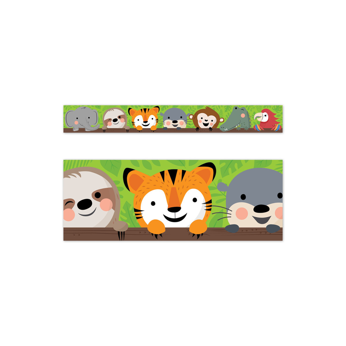 - STYLISH DESIGN – This border features 7 jungle favorites—elephant, sloth, tiger, otter, monkey, crocodile, and parrot—with a lush green backdrop that will add a touch of style to any bulletin board display.
