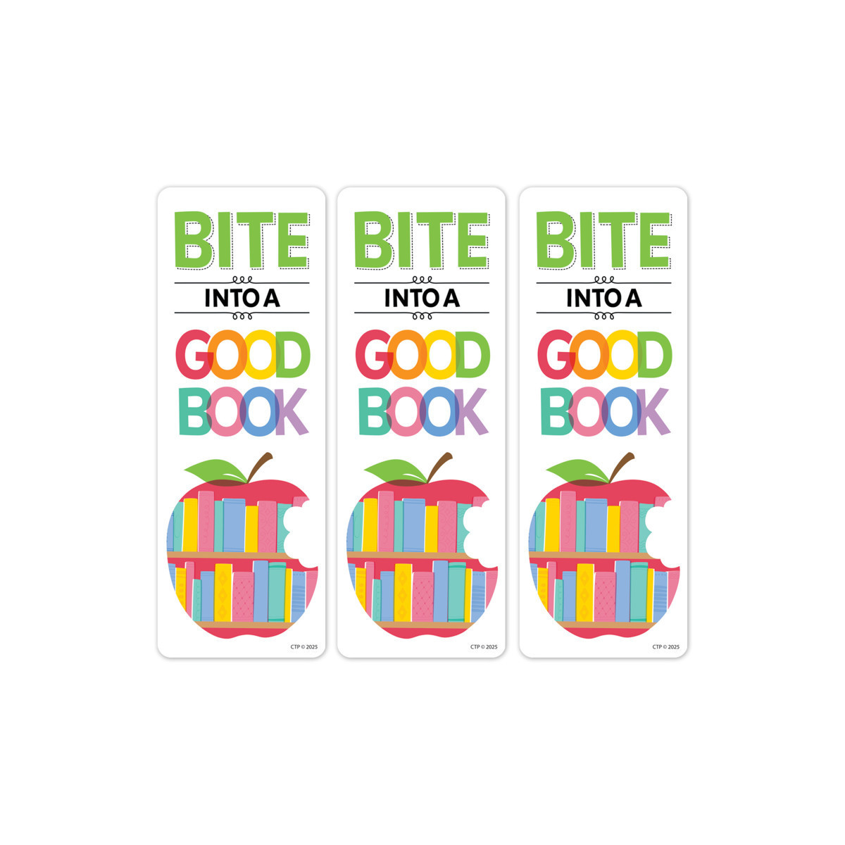 APPLE-THEMED DESIGN – The colorful apple bookshelf on these bookmarks has a bite missing, which helps illustrate the satisfaction that comes with finding the right book to read.