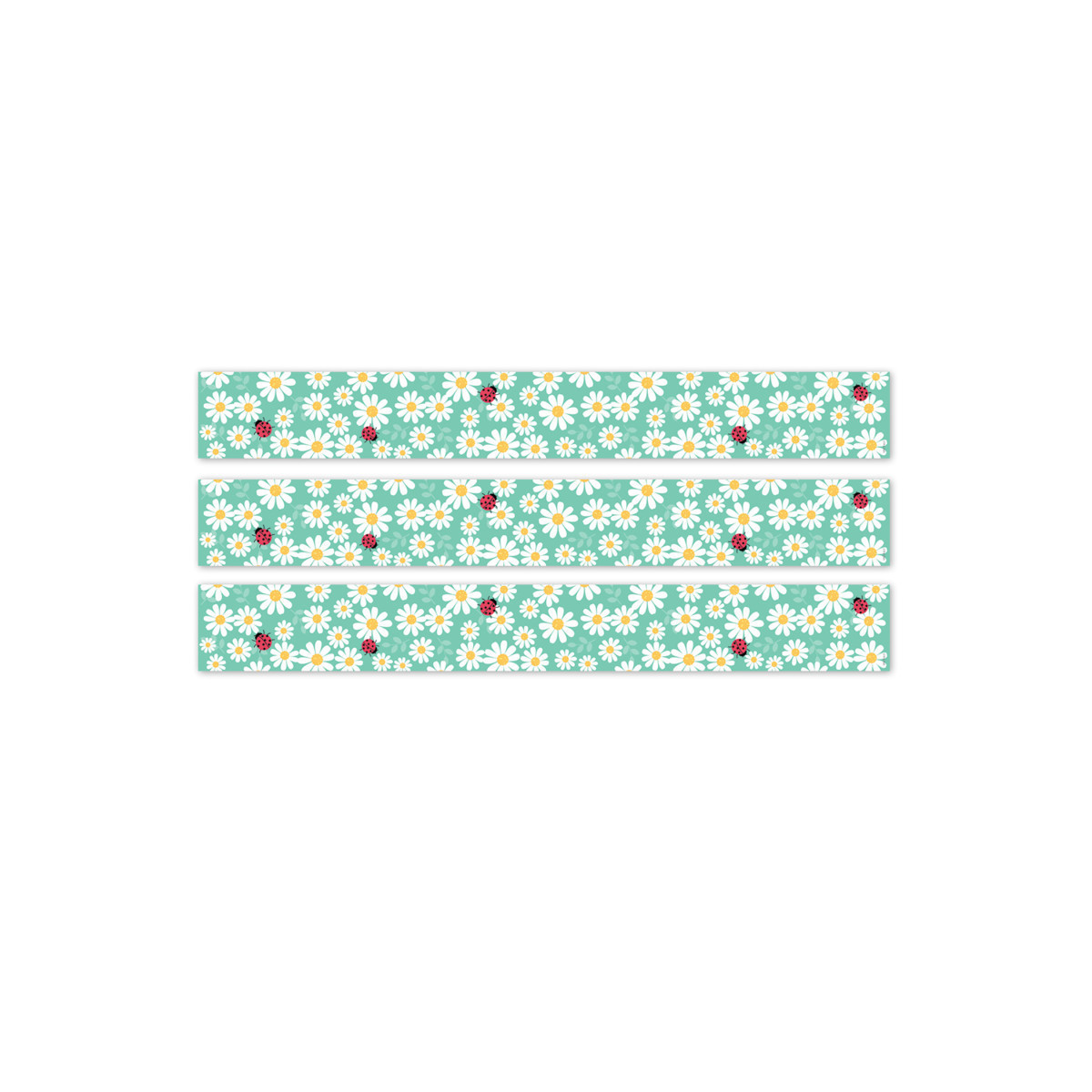 This Daisy Bug EZ Border features daisies on a teal background with scattered ladybugs, perfect for adding a fresh touch of springtime to classroom, office, or school bulletin board displays anytime of year. Each package comes with enough border to complete 2 full bulletin boards. Each pack includes 24 strips measuring 24" x 3" each for a total of 48 feet. Sold as 3 packs for a total of 72 strips (144 feet).