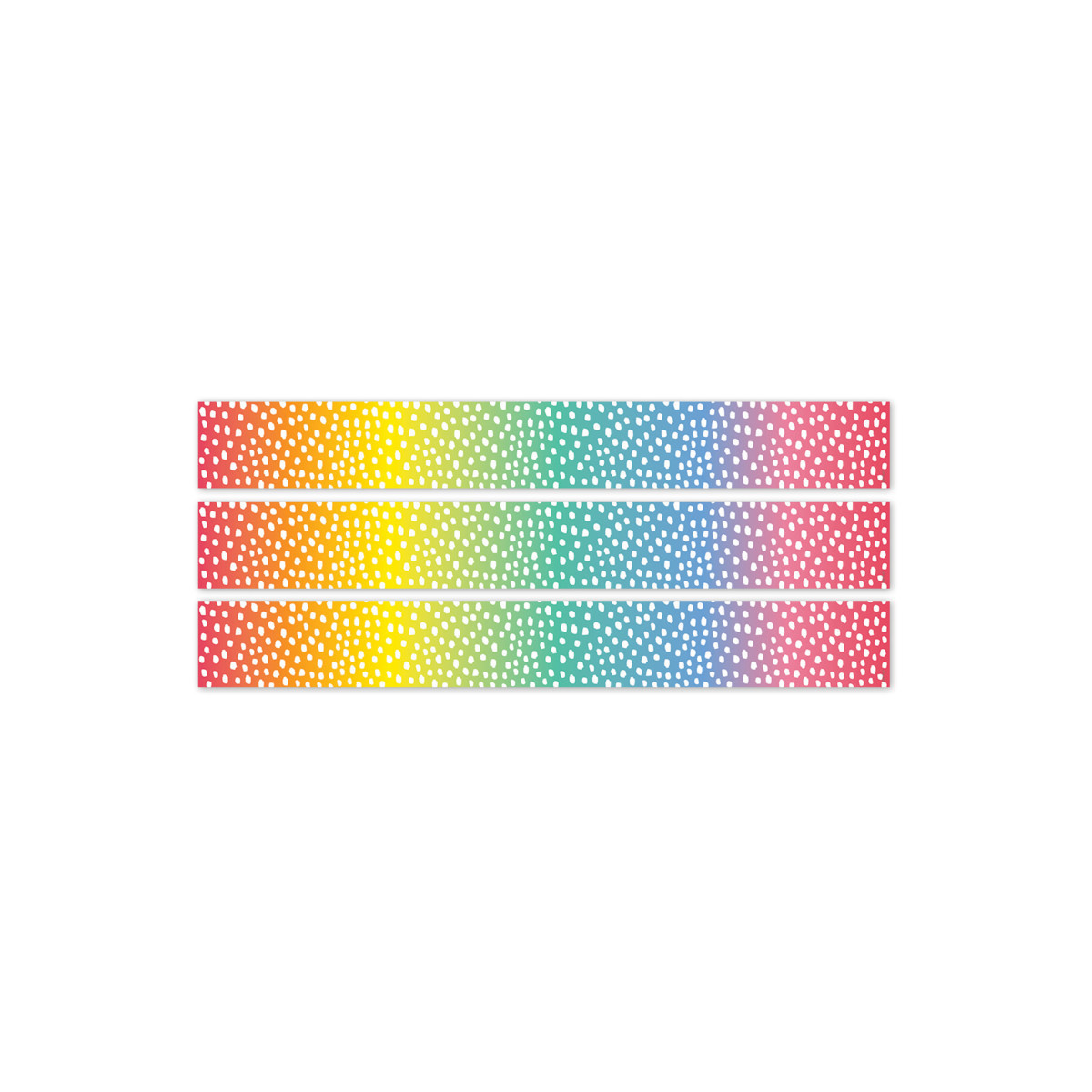 This Messy Dots on Rainbow EZ Border features white casual dots on a multicolored background. These irregularly shaped messy dots are the newest trend in polka dots. Use the border by itself or layer it with another border for a unique look. Perfect for use on bulletin boards in a wide variety of classroom, office, and school settings. Each package comes with enough borders to complete 2 full bulletin boards. Each pack includes 24 strips measuring 24" each for a total of 48 feet. Sold as 3 packs for a total of 72 strips (144 feet).