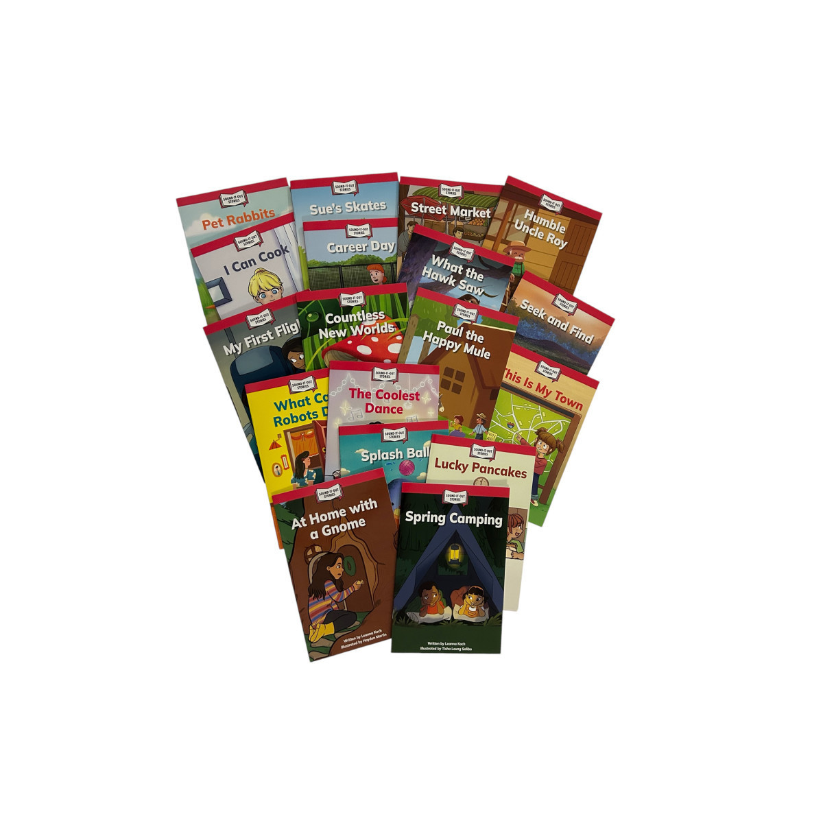 The books in set 2 of the Sound-It-Out Stories Decodable Readers series provide practice in the phonics skills that equip young readers to unlock unfamiliar words, improve reading accuracy, gain reading confidence, and read independently. Each book focuses on specific phonics patterns in the context of a fun story. Books in the series are in sequential order, from simplest to more complex, beginning with just a few skills and then including previously mastered skills. Readers are encouraged to sound out the words using letter-sound decoding strategies to experience reading success. This 18-book set comes with the following titles: Pet Rabbits, At Home with a Gnome, I Can Cook, Humble Uncle Roy, Sue's Skates, Paul the Happy Mule, What Can Robots Do?, The Coolest Dance, Splash Ball, Spring Camping, Lucky Pancakes, This Is My Town, Seek and Find, Career Day, What the Hawk Saw, Street Market, My First Flight, Countless New Worlds. Books measure 6" x 9". Each book includes 16 pages.