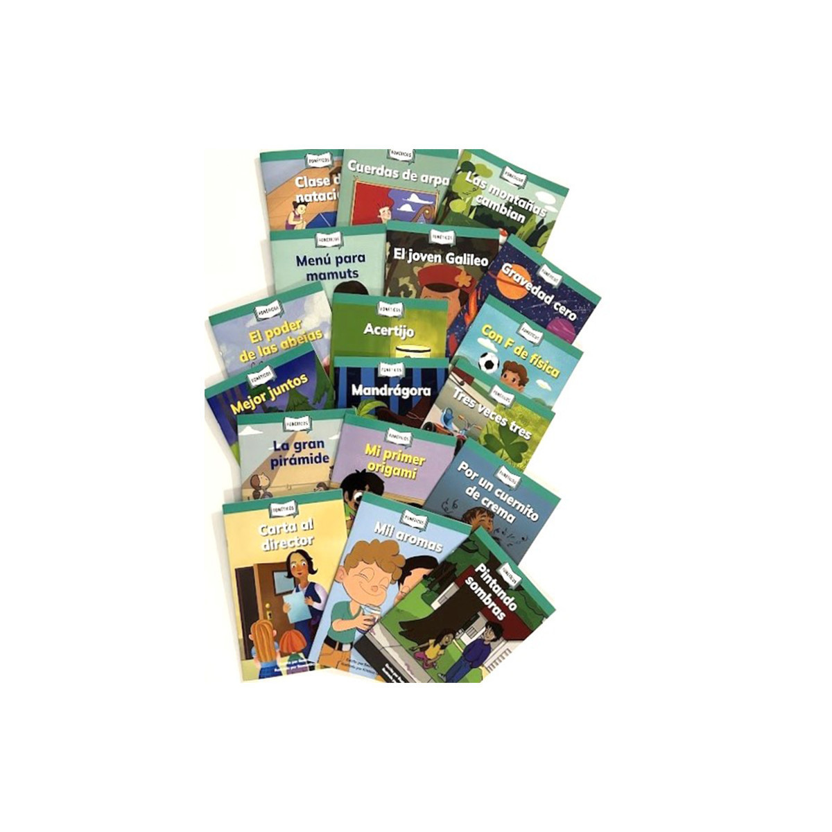 The Spanish-language books in set 2 of the Fonéticos Decodable Readers series provide practice in the phonics skills that equip young readers to unlock unfamiliar words, improve reading accuracy, gain reading confidence, and read independently. Each book focuses on specific phonics patterns in the context of a fun story. Books in the series are in sequential order, from simplest to more complex, beginning with just a few skills and then including previously mastered skills. Readers are encouraged to sound out the words using letter-sound decoding strategies to experience reading success. This 18-book set comes with the following titles: Clase de natación, Cuerdas de arpa, El joven Galileo, Menú para mamuts, Las montañas cambian, El poder de las abejas, Gravedad cero, Con F de física, Mejor juntos, Acertijo, Tres veces tres, Mandrágora, Pintando sombras, La gran pirámide, Mil aromas, Mi primer origami, Por un cuernito de crema, Carta al director. Each book measure 6" x 9". Each book includes 16 pages.