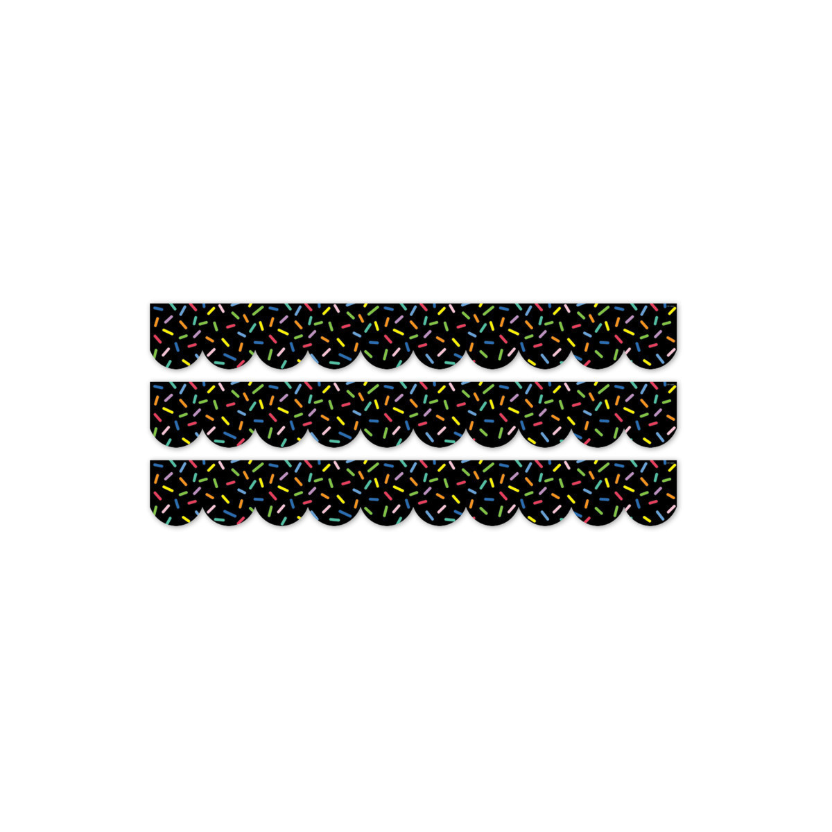 FESTIVE DESIGN – This borders colorful sprinkles on a black background evokes happy celebrations and sweet treats, and it is sure to add pizzazz to any bulletin board.