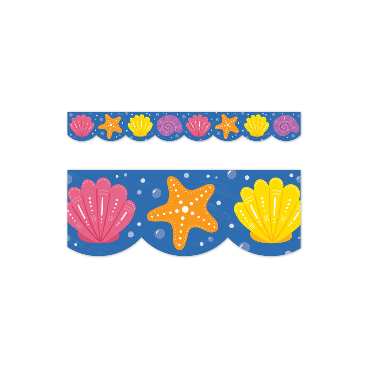 COLORFUL SEASHELLS DESIGN – Bring the seashore to your bulletin board with this colorful Seashells border. Perfect from trimming displays about ocean animals and the beach.