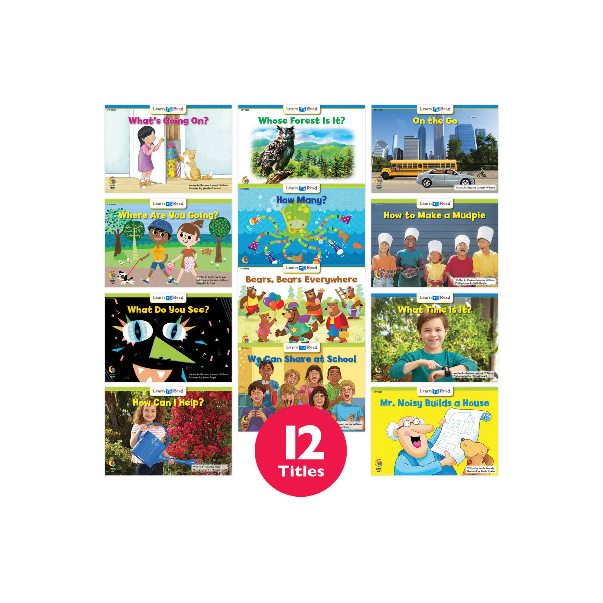 Titles include: Where Are You Going?, What Time Is It?, On the Go, Whose Forest Is It?, What's Going On?, Bears, Bears Everywhere, How to Make a Mudpie, What Do You See?, How Many?, We Can Share at School, How Can I Help?, and Mr. Noisy Builds a House.