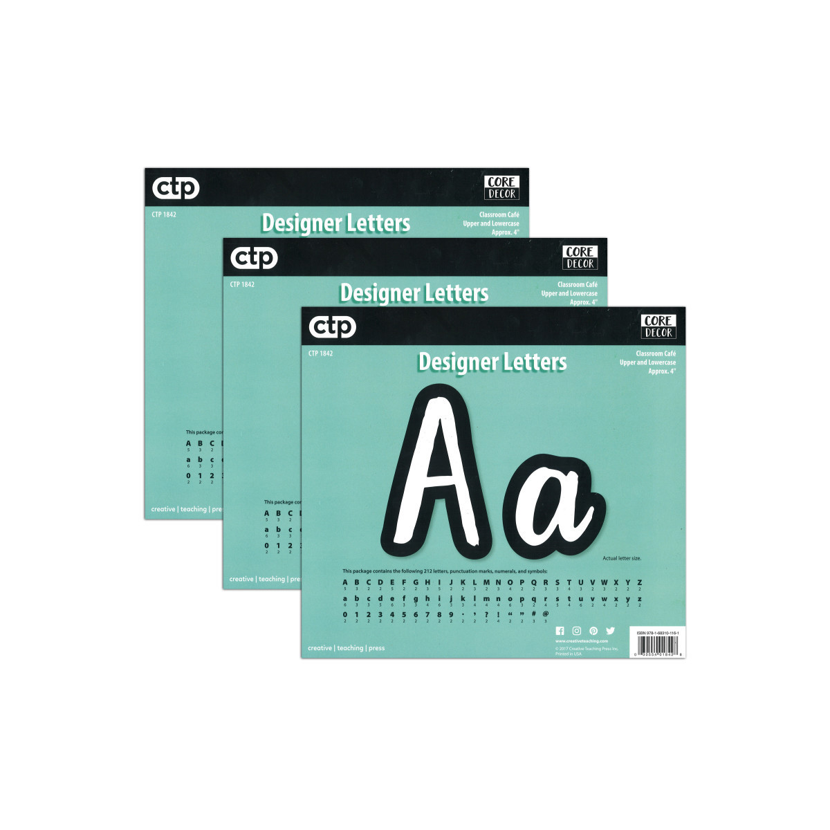 These Classroom Cafe 4" Designer Letters bring a modern flair to bulletin boards. These script-style punch out letters are white in the center with a thick black edging, making them highly visible from a distance. Each pack comes with 212 pieces, including upper and lowercase letters, punctuation marks, and numerals. Set also features social media symbols # and @. The simple, modern look of these punch-out letters makes them versatile for use on any bulletin board or display in a school, office, college dorm, senior living residence, dorm, church, or daycare center. Each pack includes 212 pieces. Sold as 3 backs for a total of 636 pieces.