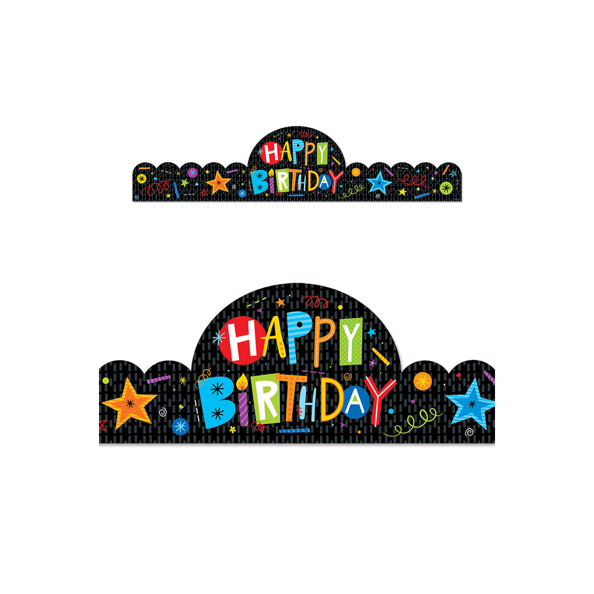 This festive Happy Birthday crown features colorful letters, stars, and multicolored confetti on a bold black background. Children will love wearing this celebratory crown on their special day. Perfect for use in any classroom, church, daycare, camp, or school setting! Crowns are adjustable. Crowns measure 24" x 6-1/2". Each pack includes 30 crowns.