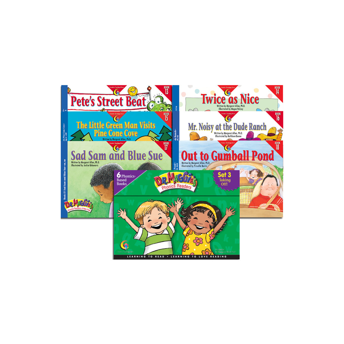 The Dr. Maggie's Phonics Readers series is rooted in current, cutting-edge phonics research. The combination of fun, high-interest stories that kids read over and over with a progression of skills that build from book to book allows children to read successfully while learning their letters and sounds, rather than only after they learn these concepts. Parents will be thrilled to see how eager their children are to read more and more. Includes six readers: Pete's Street Beat, Twice as Nice, The Little Green Man Visits Pine Cone Cove, Mr. Noisy at the Dude Ranch, Sad Sam and Blue Sue, and Out to Gumball Pond, and a parent guide.