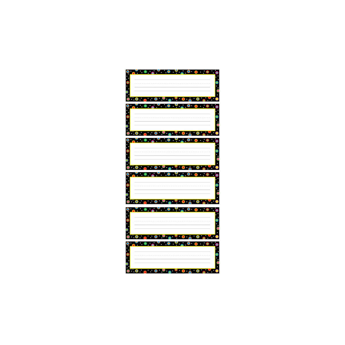 Personalize doors, desks, seats at the table, cubbies, or folders with these colorful name plates. Name plates measure 9.5" x 3.25". Each pack includes 36 name plates. Sold as 6 packs for a total of 216 name plates.