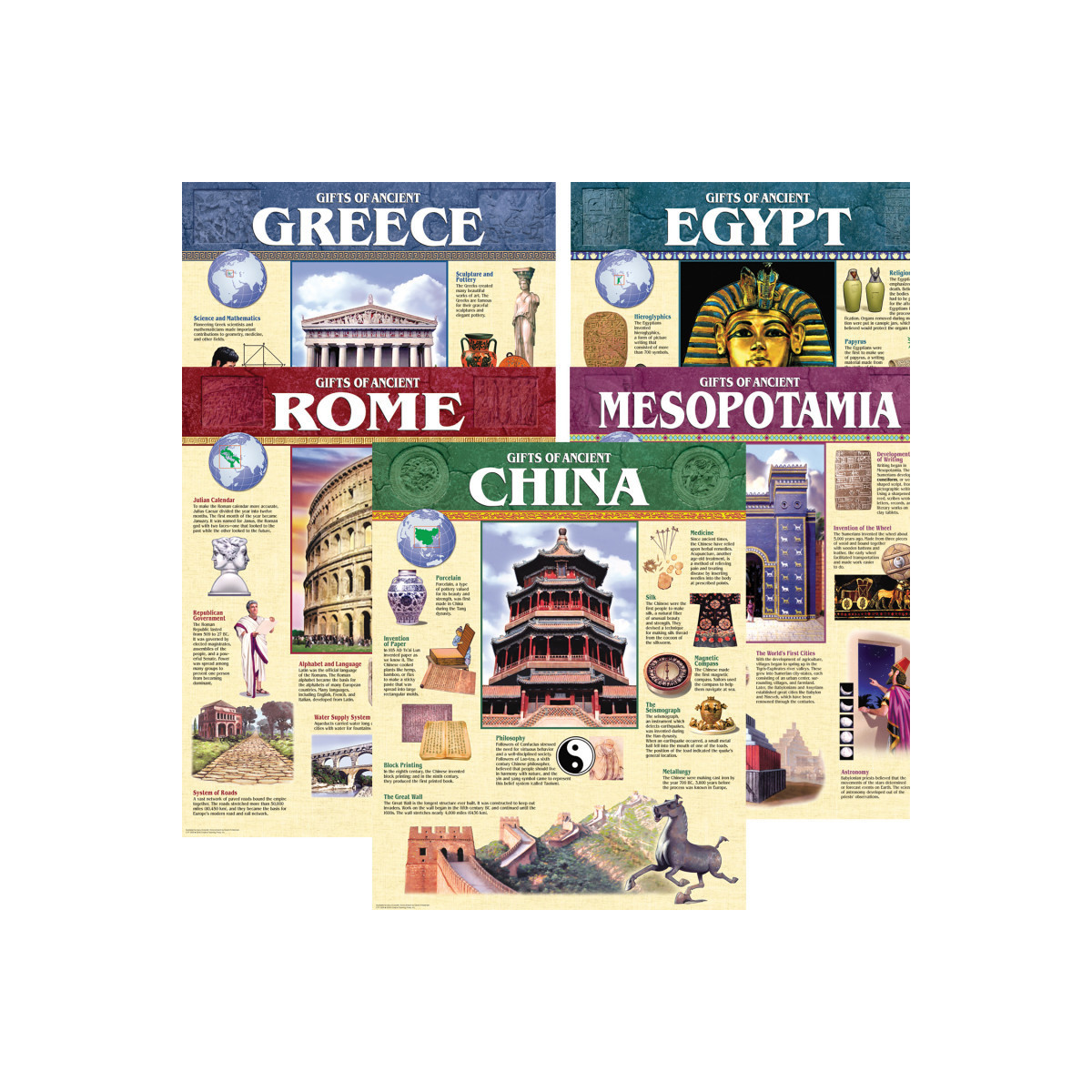 Includes 1 each of 5558 Gifts of Ancient China. 5559 Gifts of Ancient Rome, 5560 Gifts of Ancient Mesopotamia, 5561 Gifts of Ancient Egypt, and 5562 Gifts of Ancient Greece. Charts measure 17" x 21 3/8"