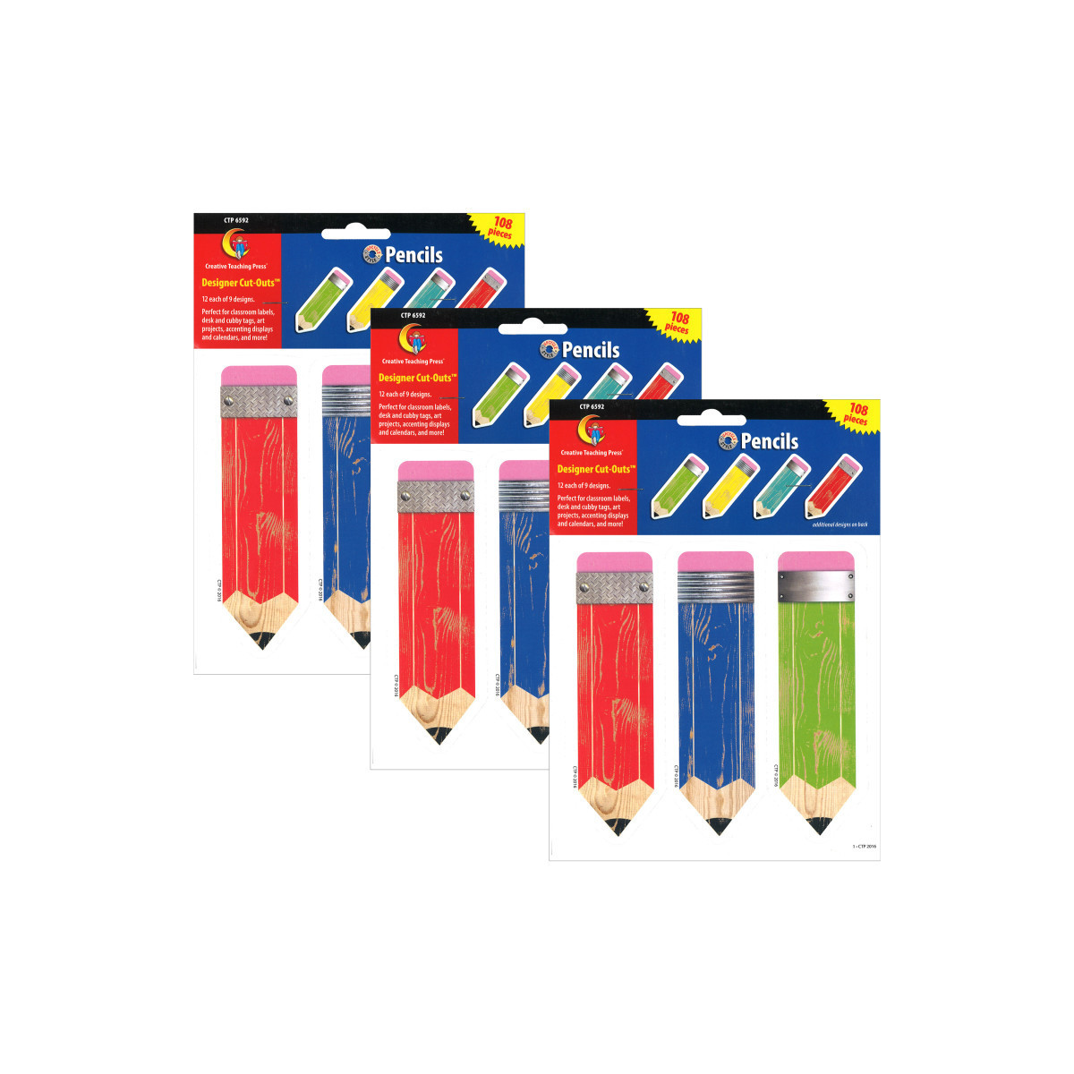 These colorful wooden Pencils 6" cut-outs are an iconic symbol of school and learning. The realistic-looking worn paint, metal banding and bright colors give these pencils cut-outs a familiar yet modern feel. The 6" cut-out size is perfect for accenting bulletin boards, as well as for use in writing centers, writing-based projects; art displays; crafts, and classroom organization/labeling. Each pack includes 108 pieces, 12 each of 9 designs. Sold as 3 packs for a total of 324 pieces.