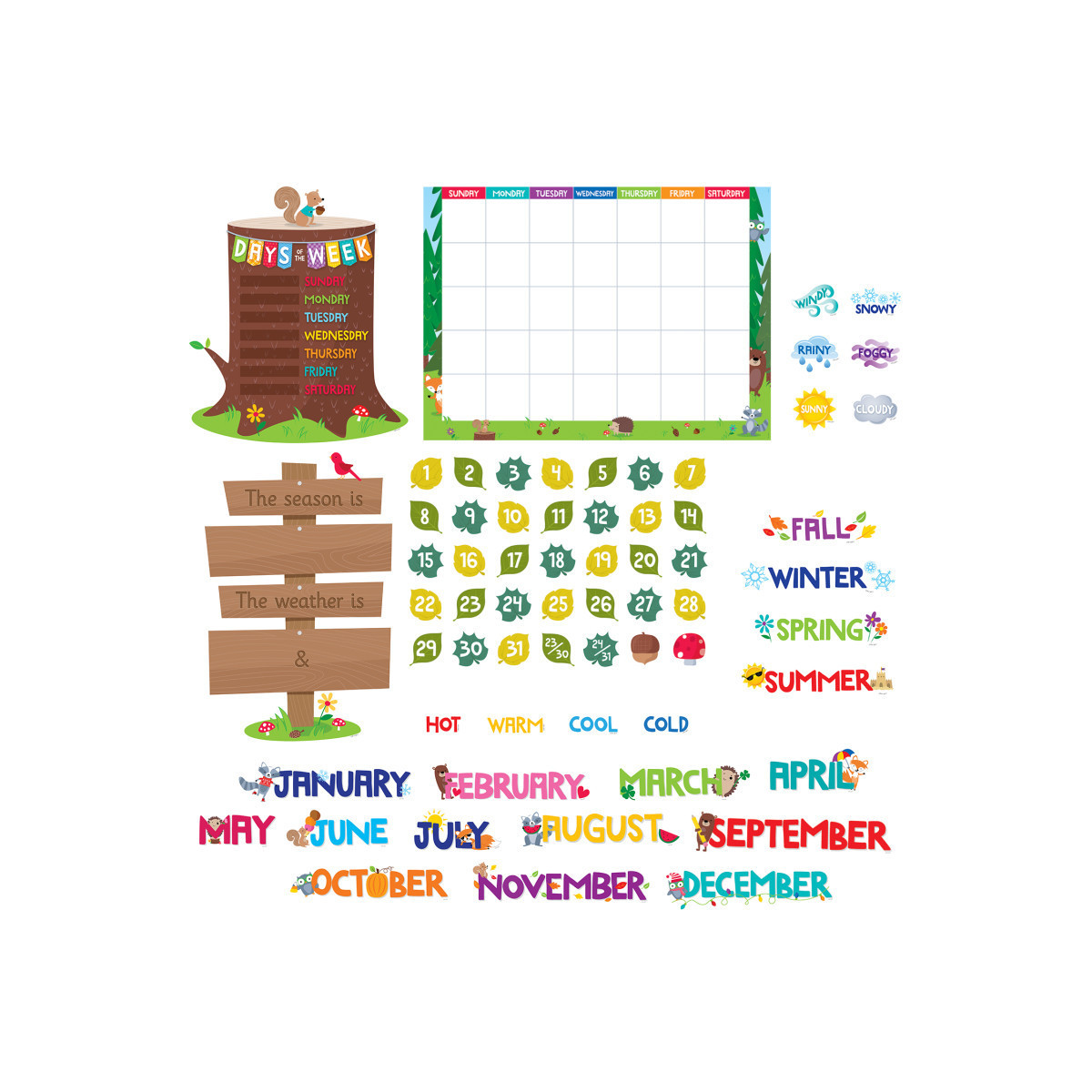 Bring a bit of the outdoors in with this Woodland Friends Calendar Set Bulletin Board! The friendly woodland animals (fox, hedgehog, bear, squirrel, rabbit, raccoon, and deer) and the woodsy scenery create a colorful calendar display that students will love. Each 67-piece calendar set features a calendar chart, 12 month headlines, 31 pre-numbered calendar days (different colored leaves that form an ABC pattern), and 4 blank calendar days. The set also includes a days-of-the-week chart, a seasons and weather chart, and coordinating labels.