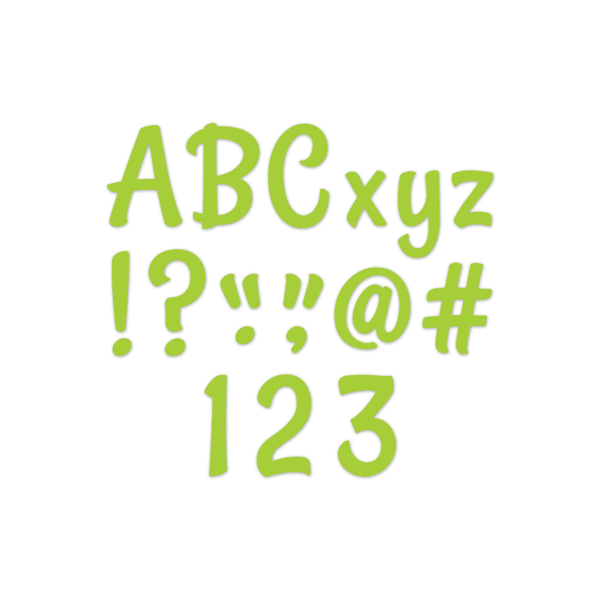 A fun, fresh twist on solid lime green letters! These Stylish Lime Green 4" Designer Letters feature a playful, hand-lettered feel. This package comes with 235 pieces, including upper- and lowercase letters, punctuation marks, and symbols. The casual design of these punch-out letters makes them versatile for use on any bulletin board or display in a school, office, college dorm, senior living residence, church, or daycare center. Measures approximately 4".