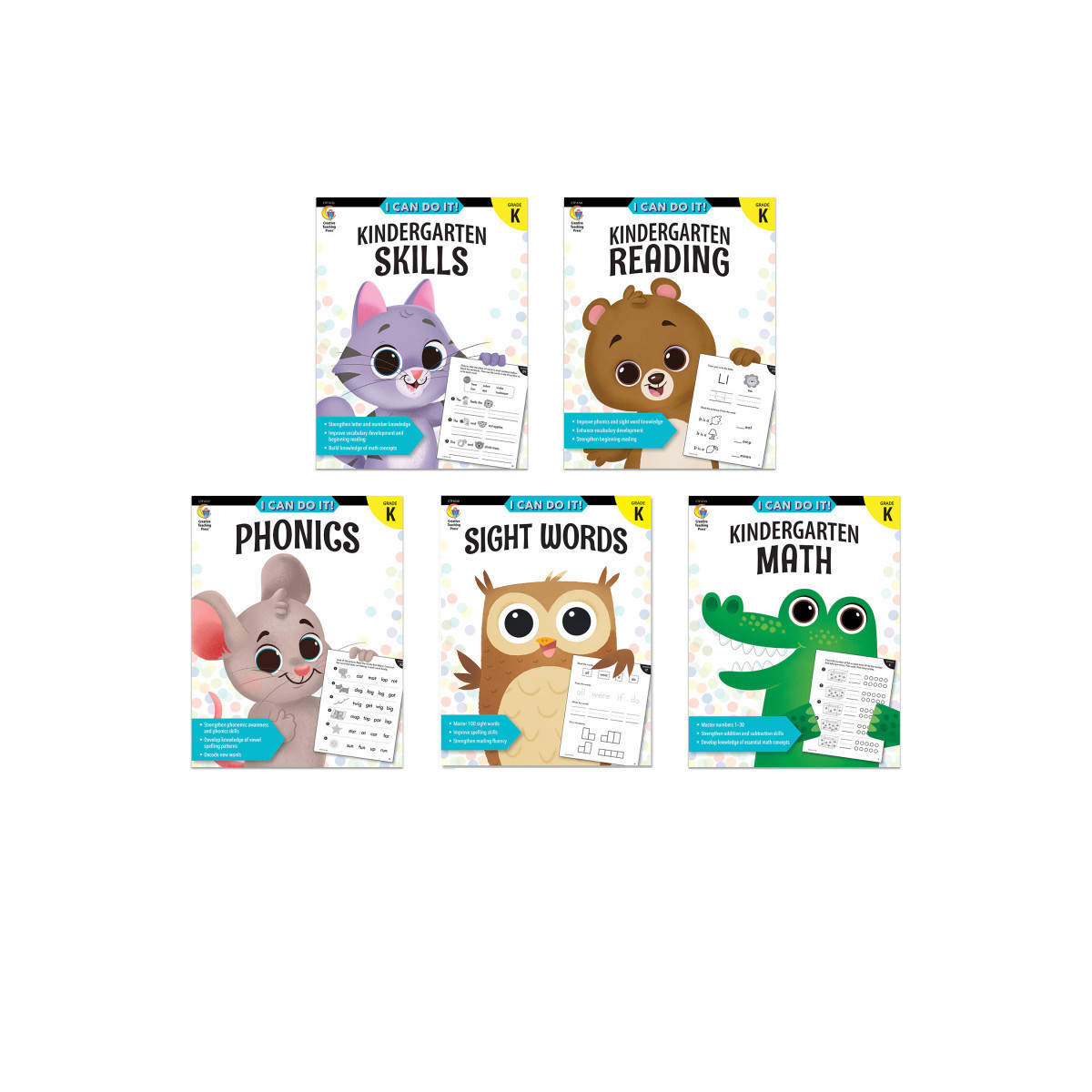 This skills practice 5-book set helps children develop letter and number knowledge, build phonemic awareness skills, and strengthen knowledge of basic math concepts. Every child can "do it" with CTPs workbook series. The activities in the I Can Do It! series provide repeated practice to aid mastery with essential skills and academic concepts. Use these books to introduce, reinforce, or extend learning. Perfect for home, school, or on the go, the I Can Do It! workbooks provide smart skill practice that makes learning fun and leads to academic success! Each book measures 7" x 9" and includes 56 pages. I Can Do It! workbooks include: practice of essential skills, skills list and parent tips, incentive chart to track progress and answer key. This 5-Book Pack contains the following titles: Kindergarten Skills, Kindergarten Reading, Phonics, Sight Words, and Kindergarten Math.