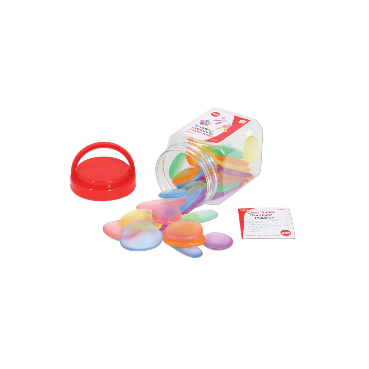 This Mini Jar set of clear, plastic Junior Rainbow Pebbles® includes 36 pieces in 3 shapes and 6 colors: blue, green, purple, pink, yellow and orange. Activity Guide included. Sizes range from 1.6"L - 2.25"L.