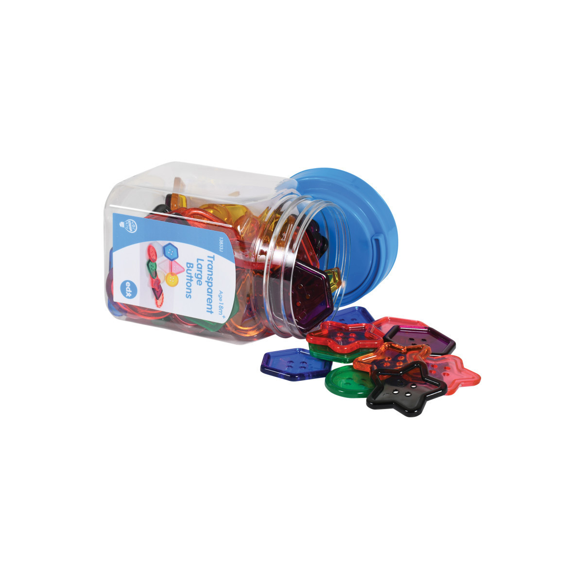Develop early math skills by weaving these buttons onto the laces provided. Great for fine motor development, sequencing activities and encouraging creativity. Strengthen dexterity, hand-eye coordination and the pincer grasp with this colorful lacing activity. Use the included activity guide for ideas on how to build fine motor and early math skills with these buttons. Transparent Large Buttons are ideal for use on a light panel to explore color mixing and sequencing. Each pack includes 0.6 lb. of large, 1.5"-2" buttons, conveniently packaged in a storage jar with lid and carry handle.
