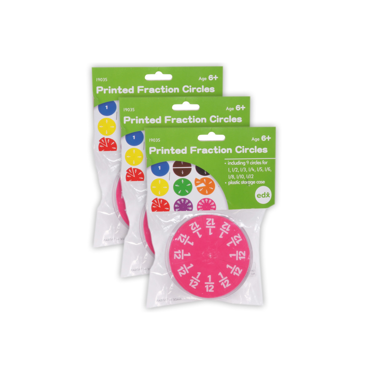 A set of 51 proportionally-sized pieces representing a whole, halves, thirds, fourths, fifths, sixths, eighths, tenths and twelfths in 9 distinct colors with printing on each piece. Packaged in a sturdy plastic case. A whole measures 3.43" diameter. Demonstrate fractional concepts and equivalency models. Students visualize and distinguish the various fractional relationships to form a whole. Sold as 3 sets for a total of 153 pieces.