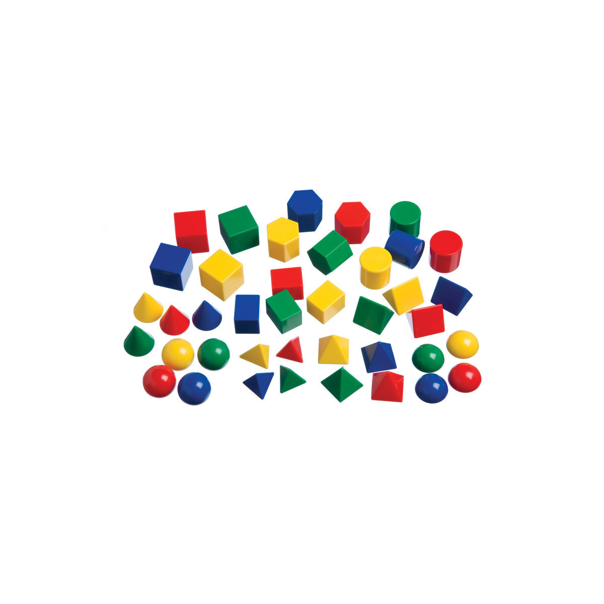 The 40 piece set includes 1" shapes in four colors: red, blue, yellow and green. Shapes include cube, cylinder, cone, sphere, hemisphere, pyramid, square prism, hexagonal prism, triangular prism, and rectangular prism. Packaged in a plastic bag. This set of smaller pieces is perfect for students to explore the properties of 3D geometric shapes. Ideal for exploring volume, surface area and nets. Made of durable plastic and easy to clean.