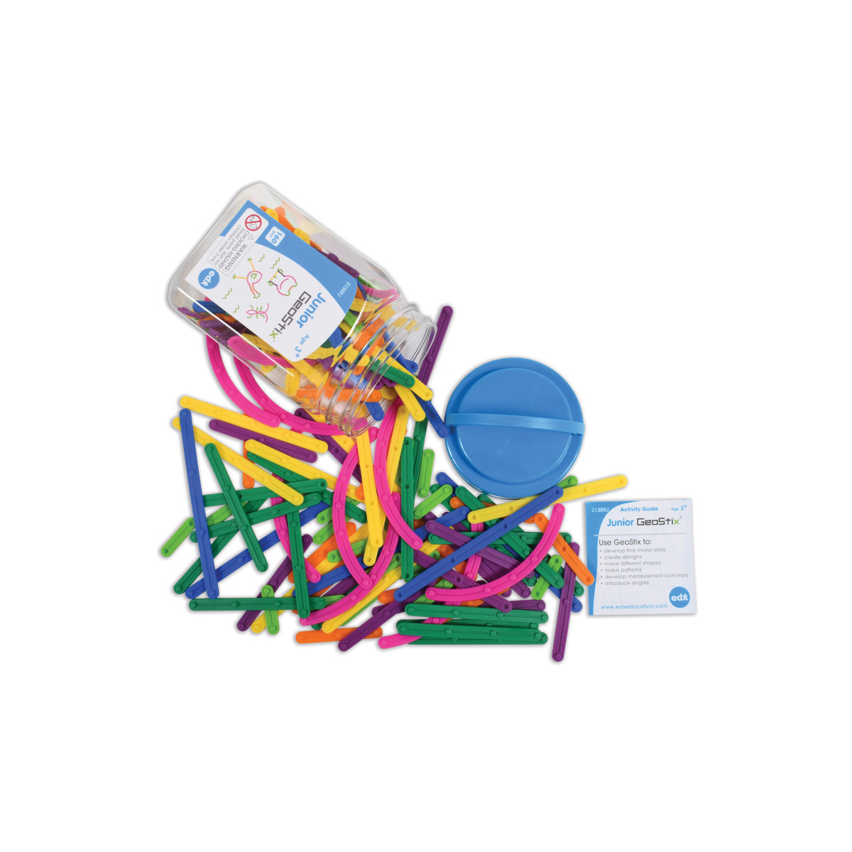 The only construction sticks that connect by snapping into place along evenly spaced increments on each piece. With Junior Geostix kids will improve fine motor skills, create designs, make different shapes and patterns, learn basic angle and measurement concepts and develop creative thinking skills. Includes 160 GeoStix in 7 sizes and 7 colors: blue, orange, dark green, light green, yellow, purple and pink. Sizes range from 1.25" to 5.25". Activity guide included.