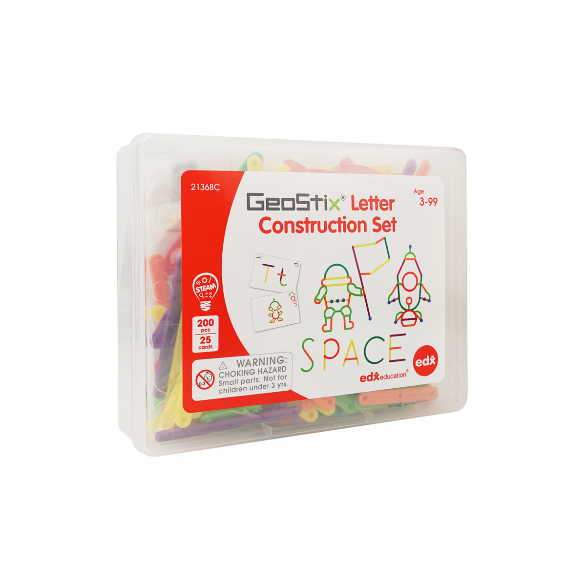 Construct letters and creative designs with the GeoStix Letter Construction Set! This fine motor toy includes 200 curved and straight connecting sticks in 10 sizes and 7 colors, plus 25 double-sided activity cards. Build uppercase and lowercase letters A-Z, practice spelling and construct basic sentences. Children will love to build dinosaurs, animals and vehicles with the Activity Cards. Or, children can create their own unique objects and designs! These connecting sticks feature multiple connection points for endless 2D and 3D creations. The sticks are flexible and easy for kid to snap together. This educational toy is packaged in a sturdy plastic container. An ideal hands-on manipulative for learning at home or in the classroom!