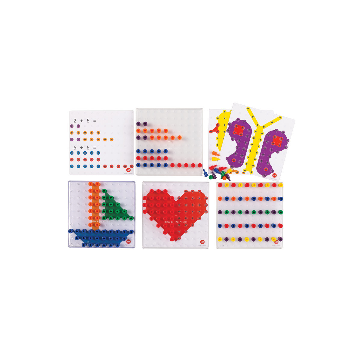 - Each 6-1/4" x 6-1/4" pegboard has 100 holes in total. The 600 colored pegs measuring 3/8" x 3/4" come in 6 different colors: red, orange, yellow, green, blue, and purple.