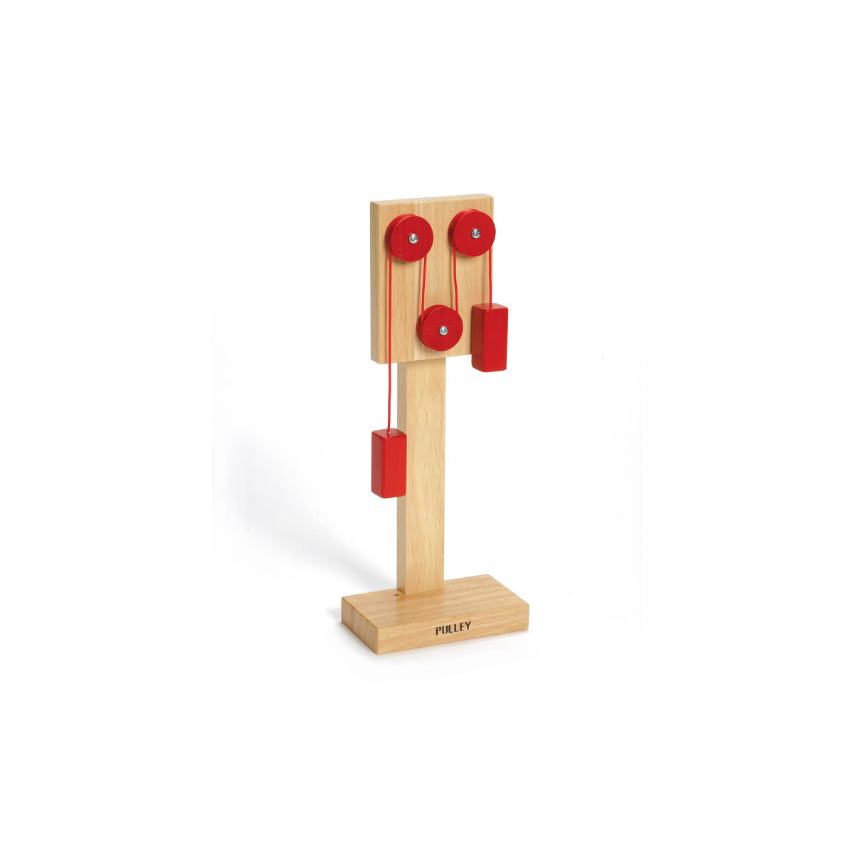 When a cord is run over a pulley, the direction of the applied force is changed. This is a very useful principle in many different machines, and a basic principle that shows up again and again in physics classes. This device lets students explore and understand this basic principle. This classic wooden model offers children a basic concept of the laws of physics. Desktop sized.