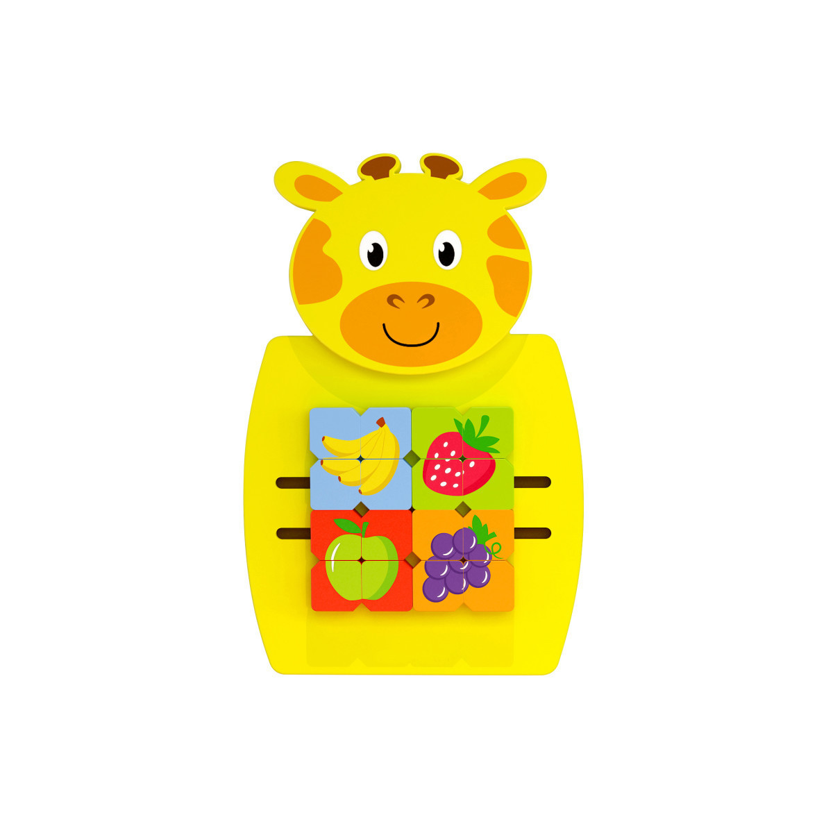 - TURN WALLS INTO A PLAYFUL SAFARI -- This wooden giraffe wall panel features 4 fruit puzzle blocks to mix and complete: bananas, strawberry, apple and grapes.