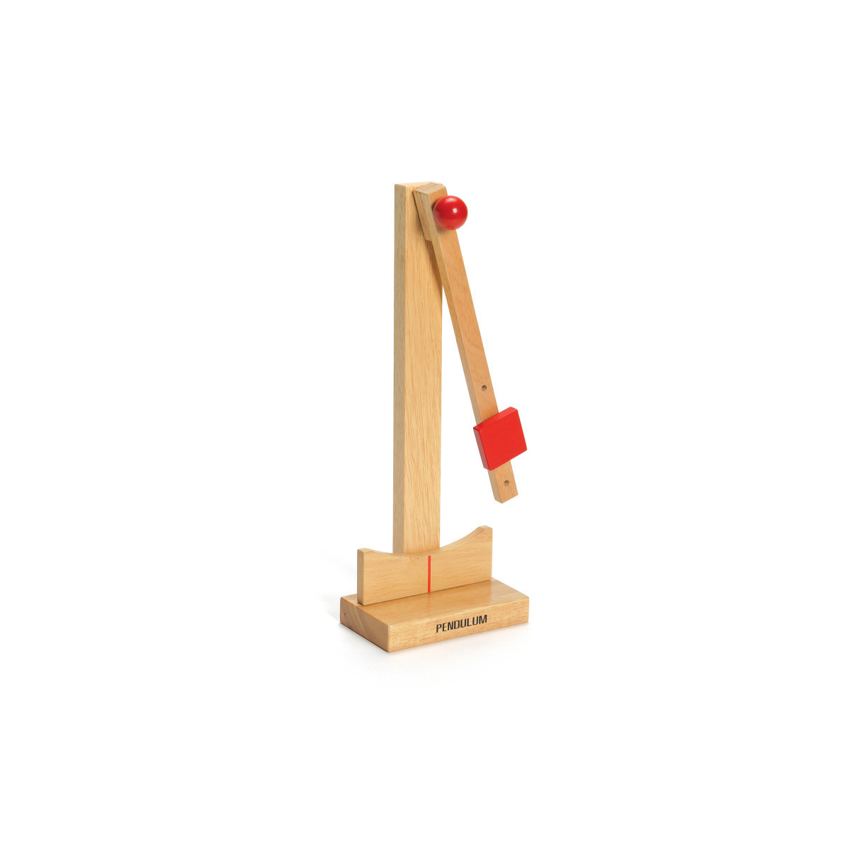As the pendulum swings back and forth, its energy changes from potential energy (the energy it has at the top of its swing, when it is raised up) into kinetic energy (the energy of motion). But the pendulum can be used as a device to explore other concepts as well. The time for one swing doesn't depend on the size of the swing or the mass at the end of the pendulum, only on the length. This is why the pendulum came to be used in the earliest accurate clocks! This classic wooden model offers children a basic concept of the laws of physics. Desktop sized.