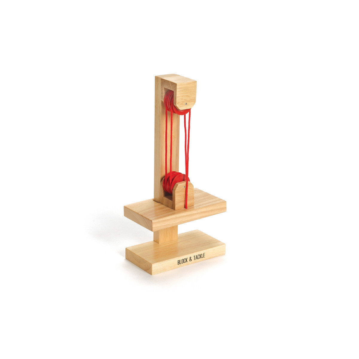 One pulley can be used to change the direction of the force applied by a cord several pulleys can be used to make this simple machine. A small force on the cord can be used to lift a large weight. Experimenting with the device shows why: lifting the block by a short distance requires that the cord be pulled a long distance. This classic wooden model offers children a basic concept of the laws of physics. Desktop sized.