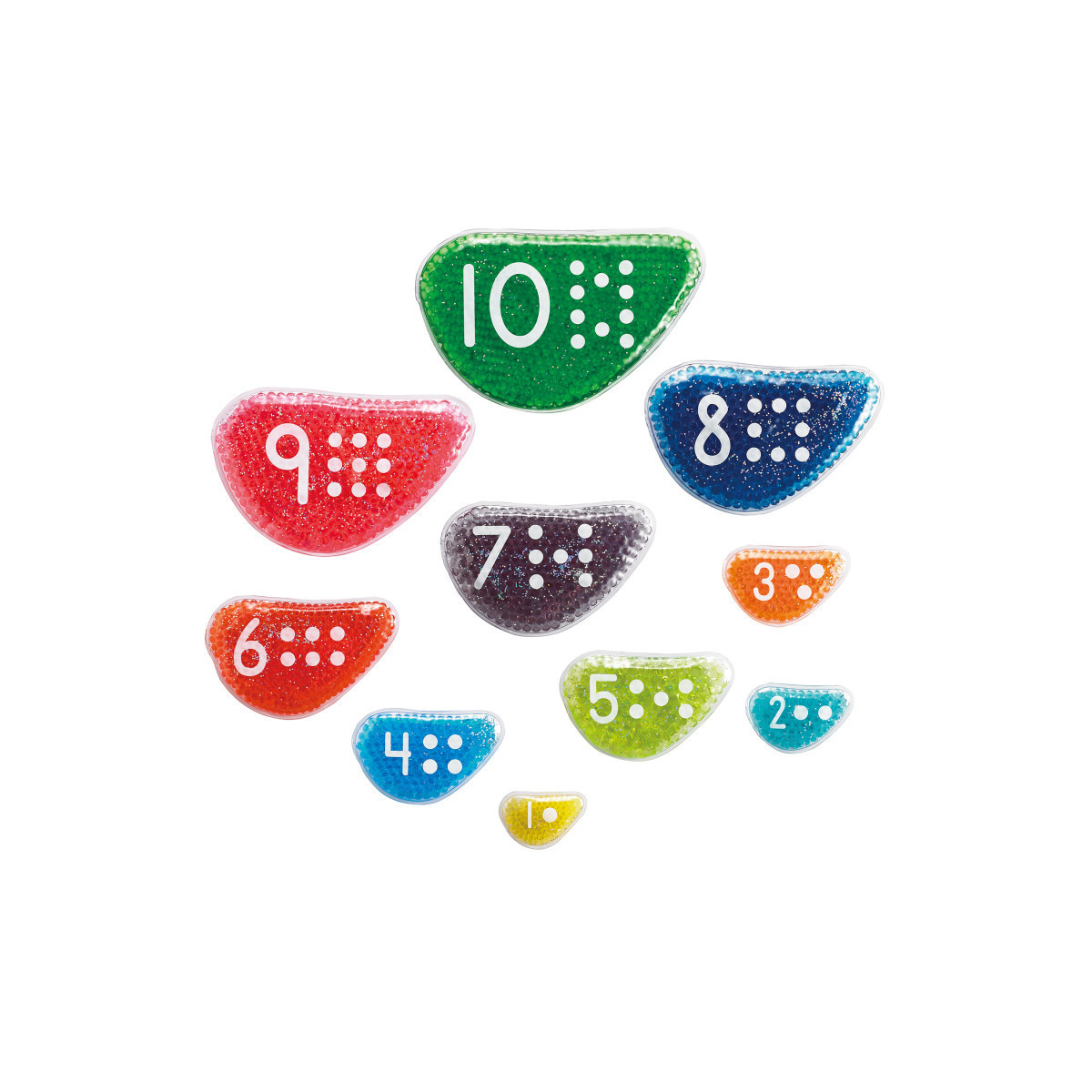 These squishy plastic counting pebbles are numbered 1-10. Each counter features a numeral and a corresponding dot pattern to help children visualize numbers. Children love to feel the squishy water beads. They're perfect for calm-down corners, sensory rooms and math classrooms. Explore color recognition, number recognition, subitizing and counting! These durable pebbles are designed to last for years of home or classroom use. They're made from non-toxic materials and are safe for little ones to use. For ages 3+.