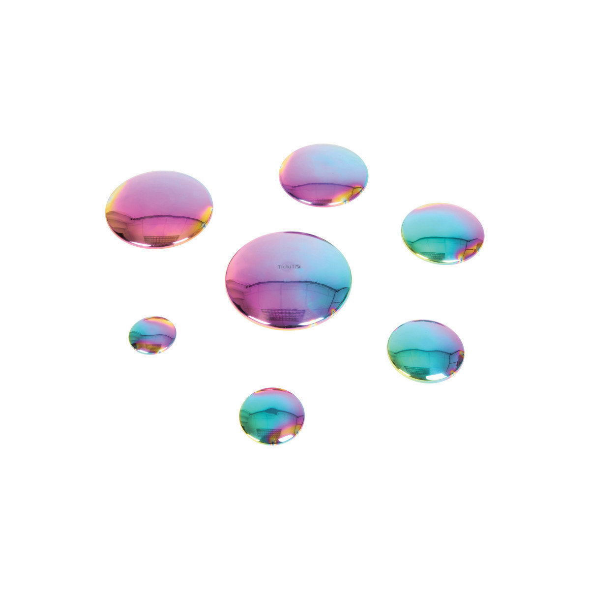 A set of 7 reflective discs for multi-sensory and stacking activities. The stunning, iridescent surface provides a slightly distorted reflection which fascinates children and encourages descriptive language. The reflective surfaces change color in the light as children manipulate the discs. They are smooth and lightweight so children can construct wobbly towers during imaginative play. The discs are chemical-free, non-porous and easy to clean, which makes them ideal for all play environments. Sensory Color Burst Buttons are made of durable, tarnish-resistant stainless steel. Sizes: 1.9"W-5.5"W. Suitable for all ages.