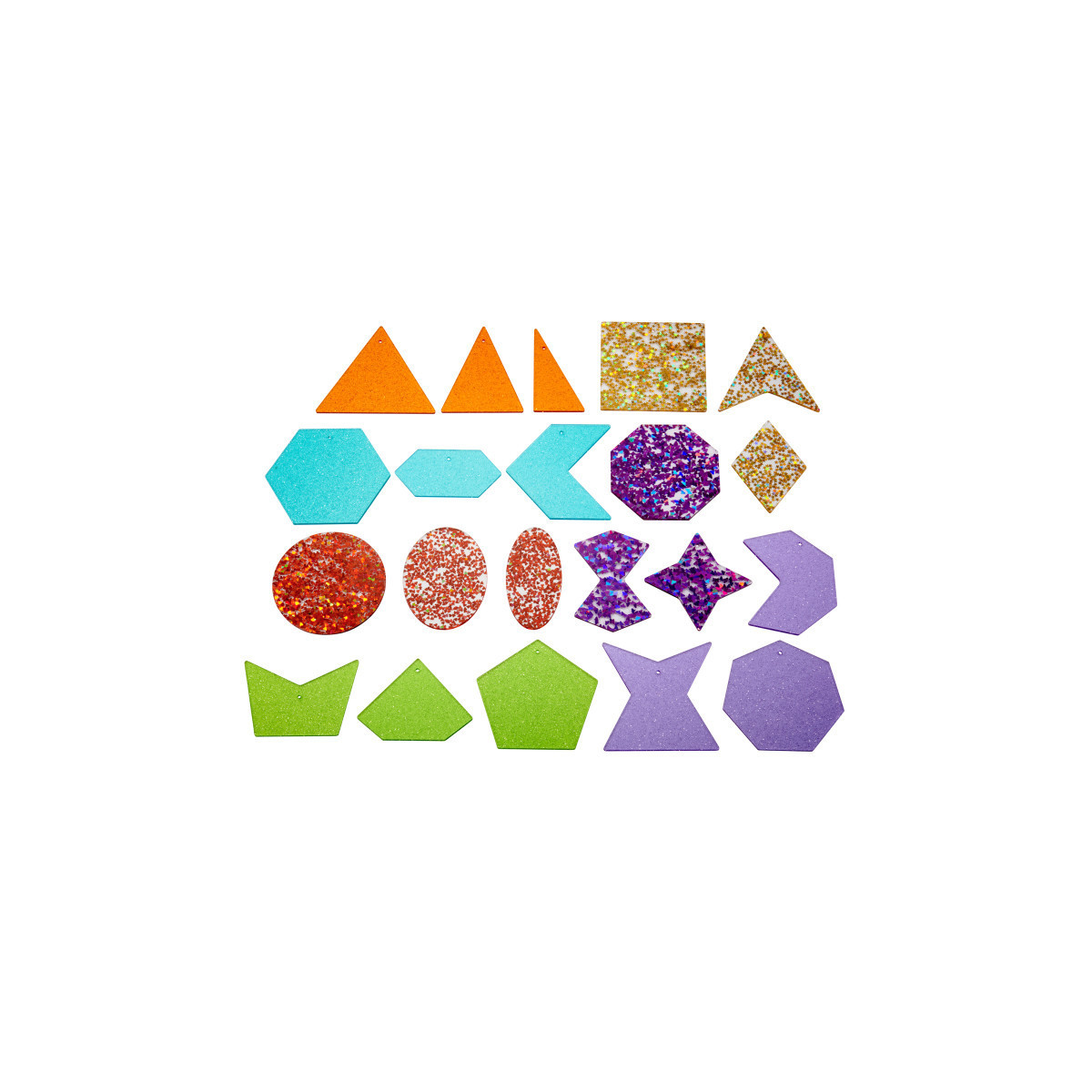 Children can explore shapes and colors with these Rainbow Glitter Shapes. The set features 21 colorful shapes and 7 different colors (three shapes per color). Each shape has a hole at the top for lacing. Use these educational toys for hands-on teaching of color and shapes. Or, hang them in front of a sunlit window to decorate your space and create colorful, eccentric shadows! Made from extra-thick acrylic, these colorful shapes are designed to last for years. And just rinse them with soap and water for a good cleaning. Size of circle: 3.9" Dia.