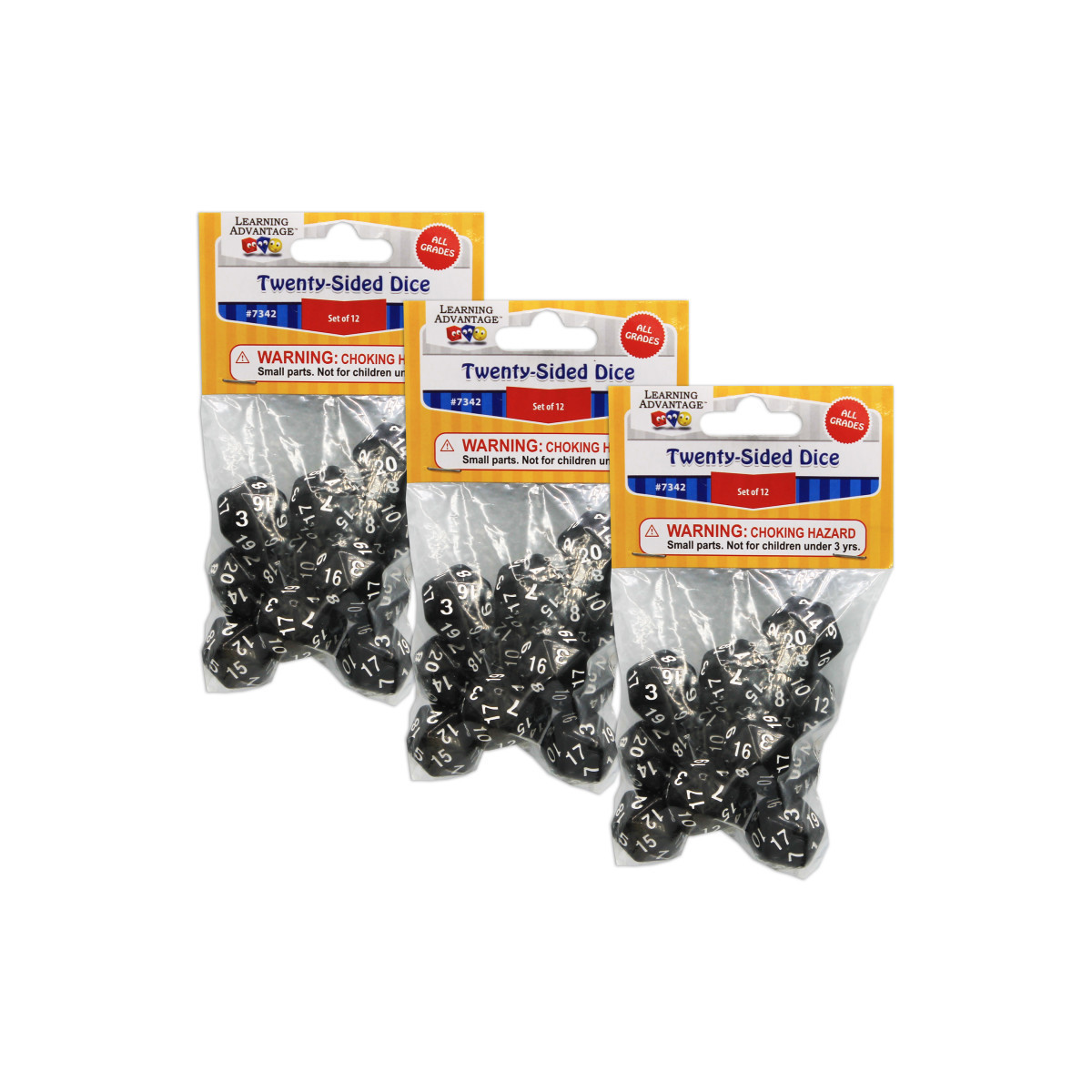 Probability and math activities come alive when using these colorful, specially configured, alternative dice. Dice can be used to explore problem solving such as number concepts, operations, probability, statistics, pre-algebra and more. Each pack includes twelve 20-sided Polyhedra Dice. Sold as 3 packs for a total of 36 dice.