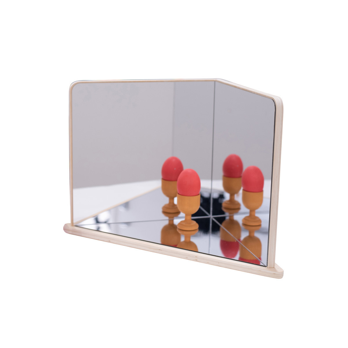 This 4-way mirror is perfect for sensory play. Create a reflective environment for children and toddlers to inspect interesting objects. Made from sturdy birchwood, this mirror is designed to last for years of home or classroom use. This toddler mirror also features rubber feet to prevent slipping and protect surfaces from scratches. Give screens a break! Use this kids mirror to reflect pebbles, marbles and other manipulatives. Use it as a base for building with blocks and explore reflections. For all ages. Size: 11.8"H x 18"L x 9.4"W.