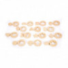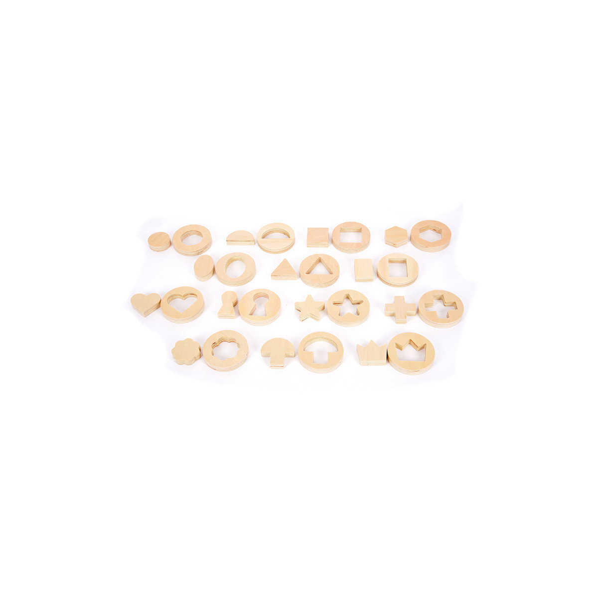 This set comes with 14 smooth birch plywood disks. Each disk features a removable shape cutout. There are 7 mathematical shapes (circle, oval, semicircle, triangle, square, rectangle and hexagon) and 7 environmental shapes (mushroom, star, keyhole, crown, cross, flower and heart). Use these disks to practice sorting, matching, shape recognition, spatial reasoning and more. Help children explore the difference between regular and irregular shapes while using descriptive language, concentration, fine motor skills and critical thinking. Children can also use these shapes for drawing and tracing. They chunky and easy for small hands to manipulate. Made from quality birch plywood, these disks are designed to last for years of home or classroom use. The set also comes with a drawstring bag and an activity guide. For ages 12m+. Size of disks: 2.6"L x 0.5"H.