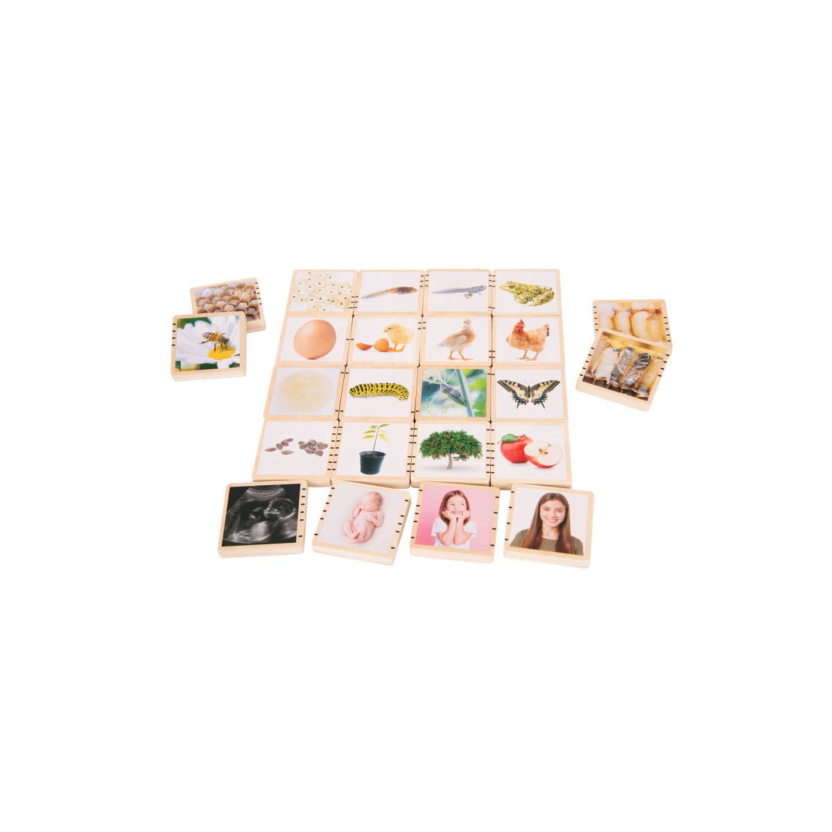 This set includes 24 self-correcting, birch plywood tiles with real photographs showing 4 life stages of humans, bees, frogs, apples, butterflies and chickens. This resource is a great tool for early literacy, science and observation. Help children understand concepts like aging in humans, plants and animals. Children can also practice matching, sorting, spacial awareness and fine motor skills as they grasp the tiles and fit them together. Children will enjoy playing while developing descriptive language, mathematical language, collaborative play and understanding the world. Images are heat pressed onto the wooden blocks and then coated with a water-based, non-toxic lacquer to ensure durability. The set also includes a storage bag and an identification guide. For ages 0m+. Size: 2.8"L x 2.8"W x 0.5"H.